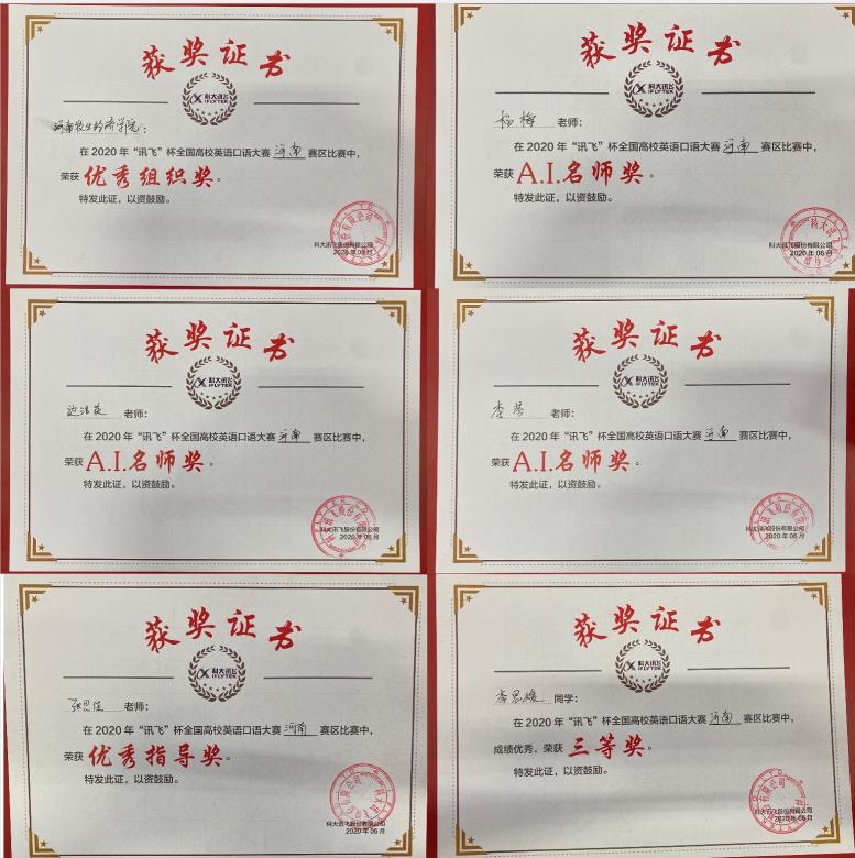 近日,今年会官网收到2020年“讯飞杯”全国高校英语口语大赛组委会颁发的获奖证书和奖品。在此次比赛中,今年会官方网站获得“优秀组织奖”, 张思佳老师获得“优秀指导奖”,今年会官方网站杨梅、李琴、边洁英三位教师获得“A.I.名师奖”,工商管理学院李思媛同学获得三等奖。