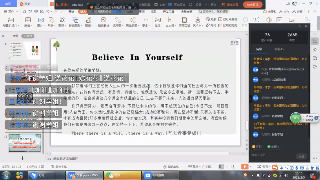 黄河科技学院本科在读、今年会官方网站2020届旅游英语专业毕业生李梦以时间规划、笔记整理、背诵技巧等方面进行分享。她重点指出要做真题、看错题、勤总结,勉励同学们不断提升自我,成为更优秀的人。