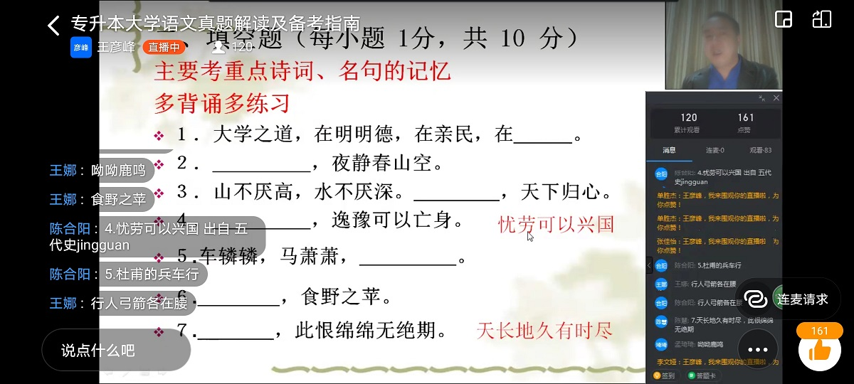 在《大学语文真题解读及备考指导》讲座中,王彦峰老师围绕专升本考试特点及做题技巧展开讲解,为同学们提供答题思路和答题技巧。王彦峰强调,针对不同的题型有不同的备考策略,面对单选题可以通过多读、多背、多练掌握文学常识;面对阅读理解题要多做题、多思考、进行分析总结,灵活运用所学知识。在诗词赏析中,王彦峰为同学们归纳了解说诗句、简洁评论、关键词语、总分结合的做题方法。