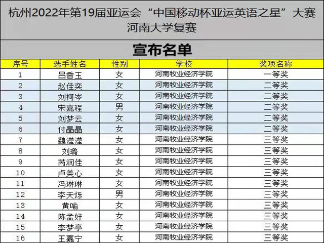 近日,今年会官方网站十六名学子参与了第19届亚运会“中国移动杯”亚运英语之星大赛河南省赛区复赛的激烈角逐。其中19级商务英语三班的吕香玉同学获河南省地区一等奖,赵佳奕、刘柯岑、宋嘉程、刘梦云、付晶晶六名同学获二等奖,魏滢滢等十名同学获三等奖。