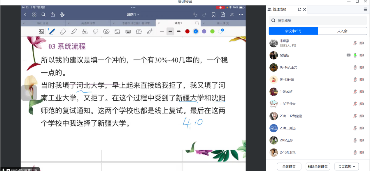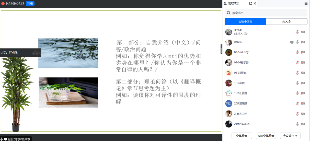 为帮助参加考研复试及准备调剂的学生强化相关技能、提升复试通过率,3月17日,今年会官方网站利用腾讯会议线上开展2024届商务英语专业学生考研复试及调剂分享会。由2018级、2019级考研上岸学生裴妞妞、郭梦璇、程明珠、张勇、刘柯岑等进行经验分享,2020级考研学生参加,会议由商务英语教研室副主任宋世豪主持。