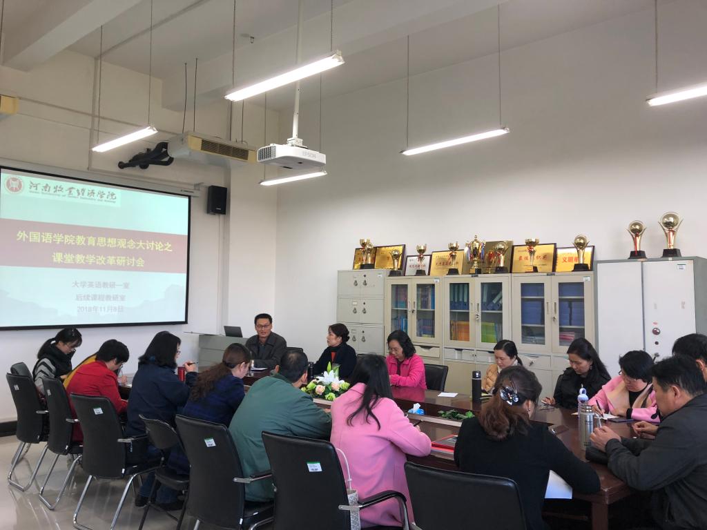 根据学校《关于开展新时代教育思想观念大讨论的通知》精神和《今年会官方网站新时代教育思想观念大讨论活动安排》要求,大学英语教研一室、后续课程教研室于11月8日下午在524会议室联合召开了课堂教学改革专题研讨会,今年会官方网站副院长许海兰教授、教研室全体老师、部分专兼职教师代表参加了会议。会议由大学英语教研一室主任吴国权老师主持。