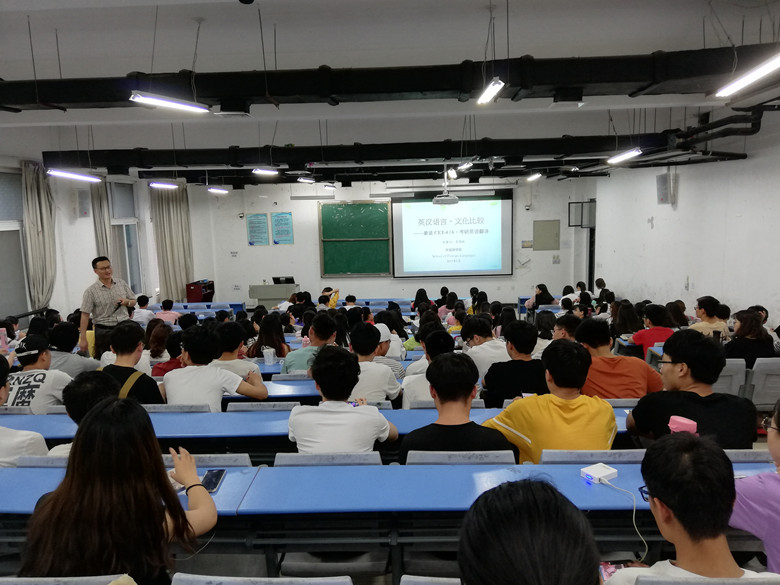 吴老师首先应学生的要求,简单介绍了大学英语四、六级和考研英语的题型、分值、用时分配,以及基本的应试策略。接着,针对历届学生在两种考试中“翻译”一题得分普遍较低的情况引出了讲座的主题:英汉语言、文化的差异与翻译。讲座从英汉两种语言对比分析入手,阐述了英汉两种语言在语言和文化两个层面的不同特征,通过大量例句深入浅出的讲解了英语的“形合”句特征、汉语的“意合”句特征以及在翻译实践中的不同处理方式;从词法和句法翻译两个方面有针对性地为同学讲解了应对四六级和考研英语翻译的基本策略和应试技巧,提醒同学们在实战中要充分注意到英语一词多义的现象,根据词性、上下文和词的搭配等不同做好词义的选择或引申。