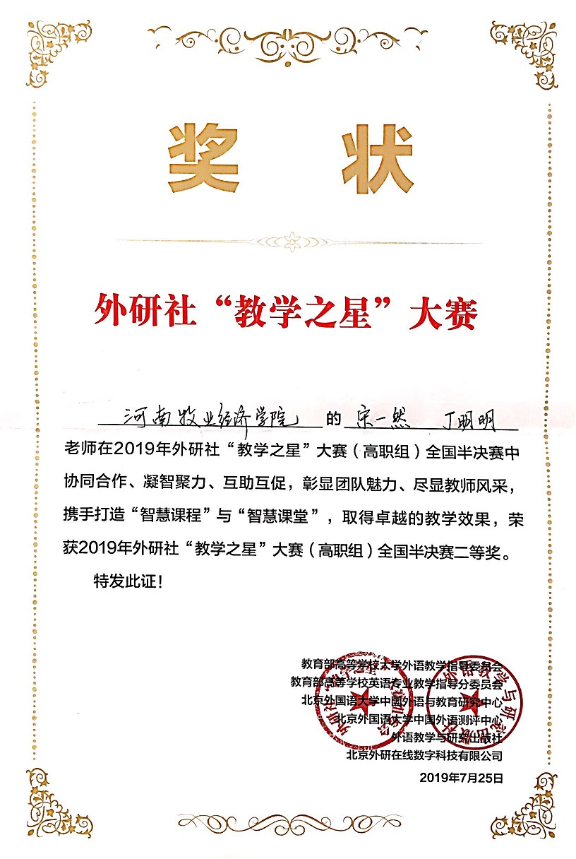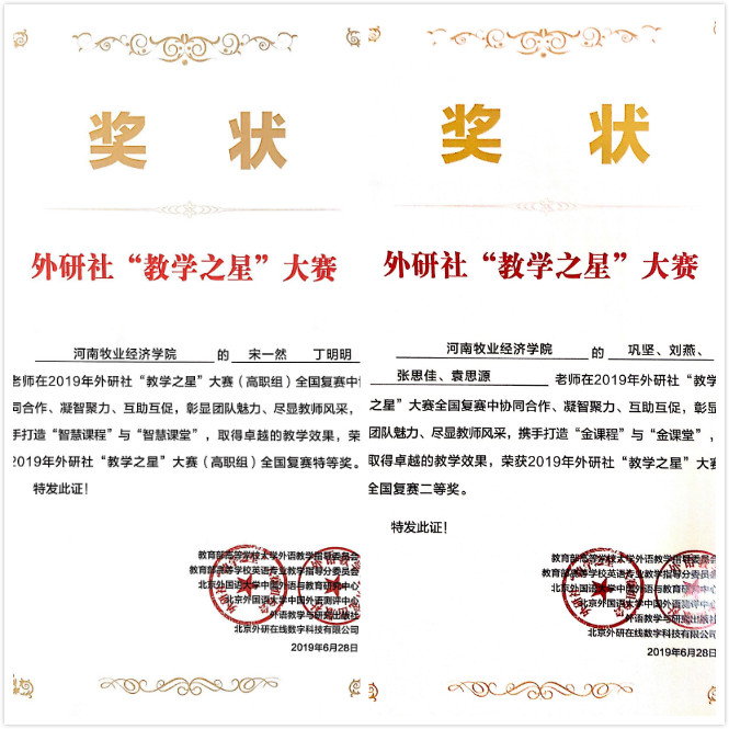 今年会官方网站始终把锤炼教师教学基本技能,提升课堂教学质量作为工作重点,同时积极打造高素质、专业化、创新型金牌外语教师队伍。今年五月接到2019年外研社“外研之星”教学大赛通知之后,今年会官方网站精心组织,通过今年会官网的三级教学观摩课活动,选拔出三组教师团队分别参加高职组、大学英语组、英语类专业组组三个级别的比赛。参赛团队以OBE理念为主导,在教学设计上突出成效导向和智慧课堂在英语教学实践中所起到的融合、创新和引领作用,通过线上与线下融合、语言与专业融合、教学与产业融合的教学模式,实现对学生的语言能力、思维能力、学习能力的综合培养。在全国复赛阶段,今年会官网以巩坚、刘燕、张思佳、袁思源组成的团队获得大学英语组二等奖,以温晶晶、禹琳琳、边洁英组成的团队获得英语类专业组二等奖,以宋一然、丁明明组成的团队获得高职组特等奖,并晋级全国半决赛。7月 25日,在苏州全国半决赛现场上,宋一然、丁明明分工协作,完成了课程设计阐释、教学展示、评委问答三个环节,荣获二等奖。