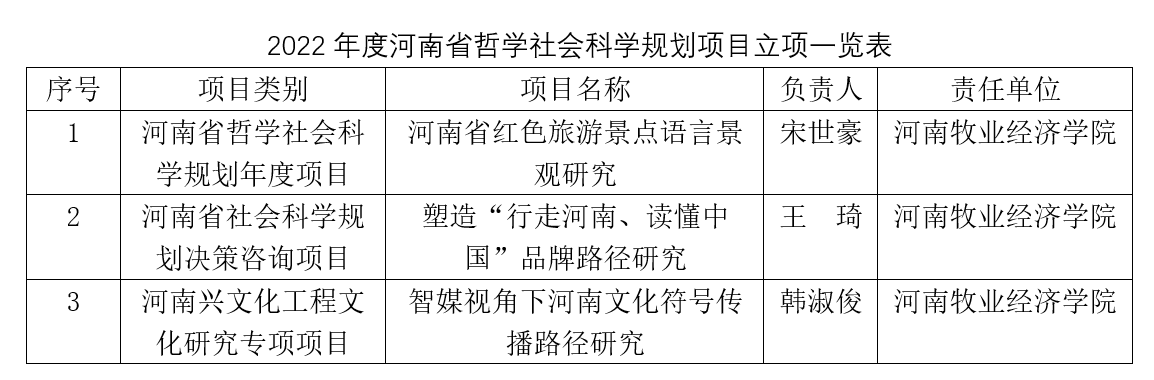 近日,河南省哲学社会科学规划办公室公布了2022年河南省哲学社会学科规划项目的立项名单。今年会官网韩淑俊博士主持《智媒视角下河南文化符号传播路径研究》获批河南兴文化工程文化研究专项项目,宋世豪博士主持《河南省红色旅游景点语言景观研究》获批河南省哲学社会科学规划年度项目,在读博士王琦老师主持《塑造“行走河南、读懂中国”品牌路径研究》获批河南省社会科学规划决策咨询项目。