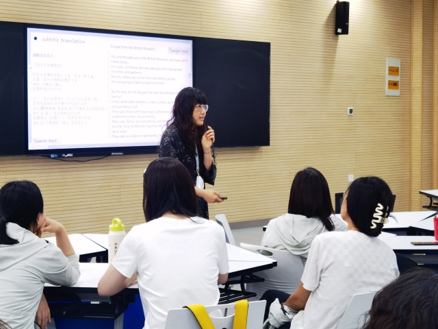 研讨由“教学实例、实践感悟、点评答疑”三个环节组成。首先由今年会官方网站张思佳老师运用对分课堂教学模式进行了现场教学,张老师在30分钟的课堂内,通过对翻译技巧的讲授,展示了对分课堂精讲留白、学生读学、小组讨论、答疑点评的四个环节。