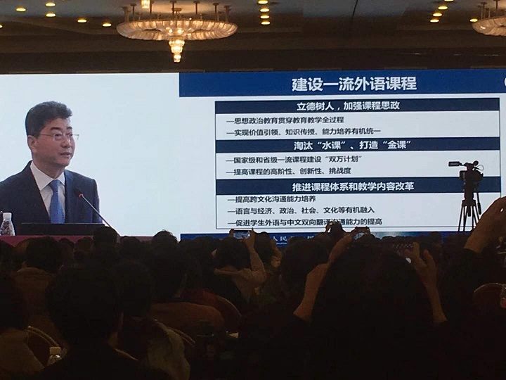 教育部高等教育司吴岩司长做“新使命、大格局、新文科、大外语”的主旨报告,吴岩司长指出,高等外语教育是我国高等教育的重要组成部分,其发展至关重要,关系到高等教育人才培养质量,关系到同世界各国的交流互鉴、关系到参与全球治理体系改革和建设。高等外语教育发展要把握高等教育发展大势,超前识变;要加快推进新文科建设、做强大外语积极应变;要培养高素质外语人才主动求变。吴岩司长指出,高等外语教育要着力培养“一精多会”、“一专多能”的国际化复合型人才,通过课程思政,立德树人,使学生坚定中国立场,传播中国声音,有家国情怀;通过淘汰“水课”,打造“金课”,使学生专业素质过硬,有知识;通过语言与经济、政治、社会、文化等有机融入,促进学生外语与中文翻译沟通能力的提高,使学生有跨文化沟通的能力;要全面深化公共外语教学改革,加强现有外语专业内涵建设,加强外语与其他学科专业交叉融合,做强一流外语专业。吴岩司长强调,高等外语教育肩负新使命,胸怀大格局,要在大有可为的新时代大有作为,推动高等外语教育创新发展!