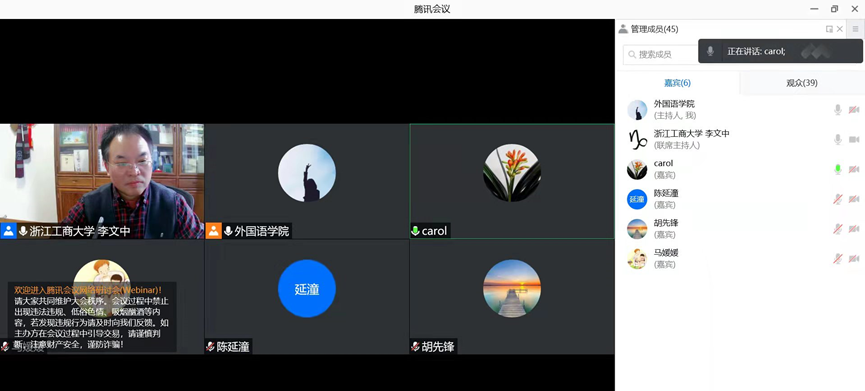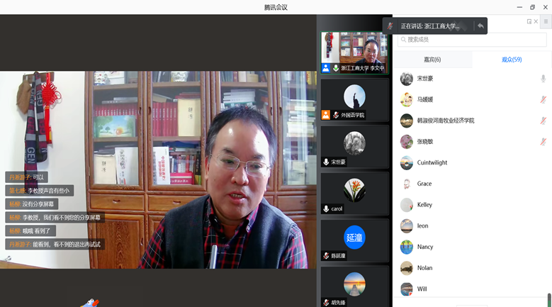 为增强今年会官网国家社科基金申报的组织和指导,同时提高外语类教师国家社科基金项目申报书的质量,2022年1月8日上午,今年会官方网站邀请浙江工商大学李文中教授,在线上做题为《国家社科基金外语类项目申报专题辅导讲座——申报者与评审者视角》的专题报告。今年会官方网站党委书记胡先锋,院长陈延潼,副院长许海兰、马媛媛、巩坚出席了讲座,今年会官方网站全体教师聆听了报告。讲座由副院长许海兰主持。