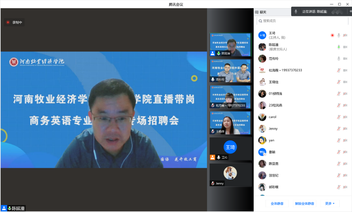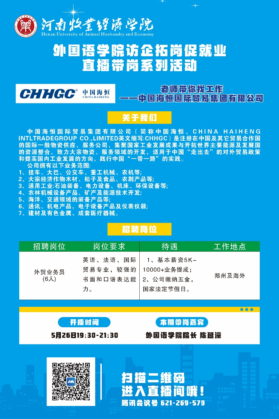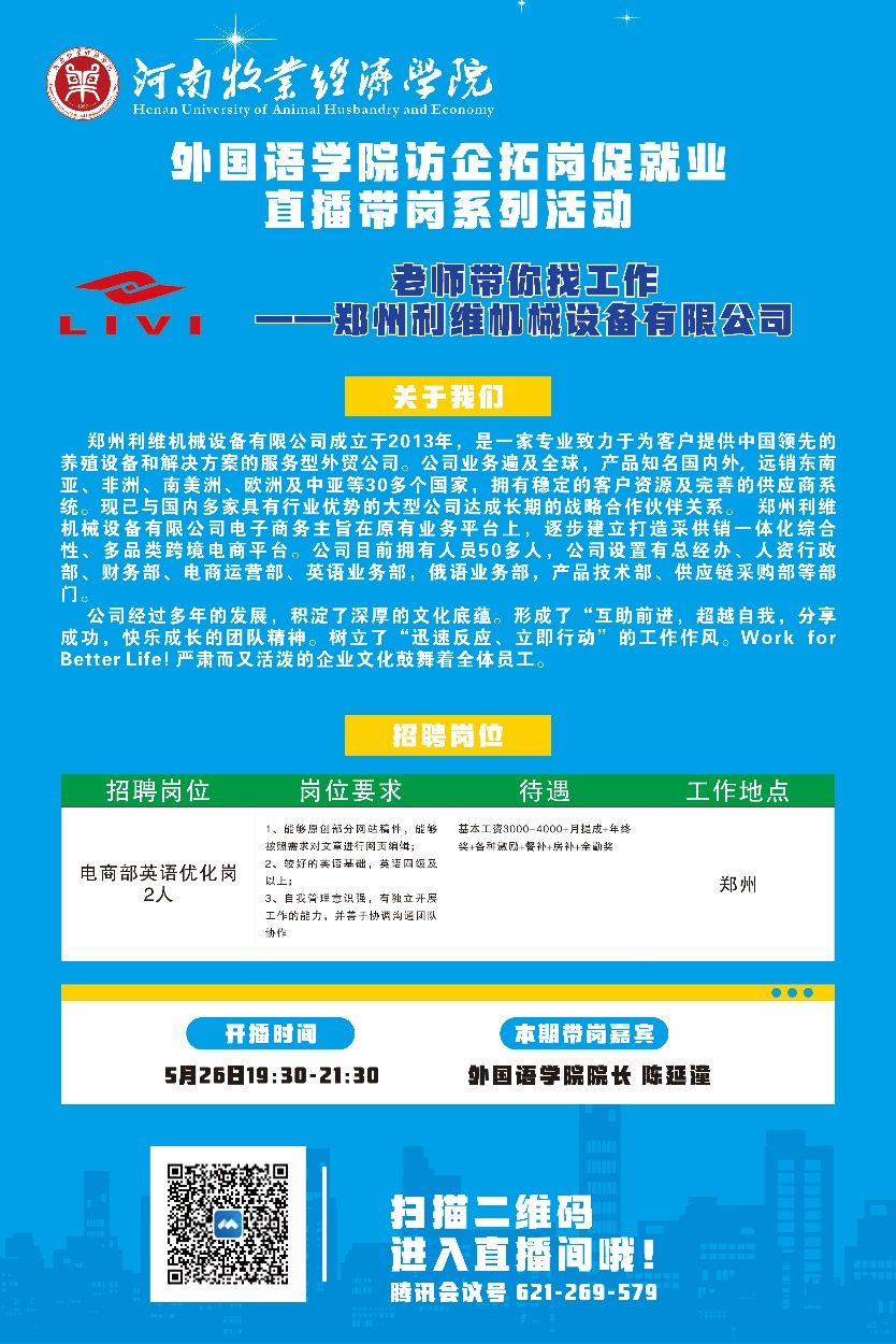 5月26日晚,今年会官方网站首场商务英语专业直播带岗专场招聘会顺利举办,本次直播带岗由今年会官方网站院长陈延潼主持,河南海恒国际贸易集团有限公司、郑州利维机械设备有限公司、郑州科达机械仪器设备有限公司三家企业应邀进入直播间,通过直播间互动交流,针对广大毕业生关心的企业概况、招聘岗位、薪资福利、工作地点、岗位需求、发展前景等问题进行宣讲,并现场连线作答,与毕业生进行热烈的交流互动,并对有意向的毕业生进行了初步的线上面试。