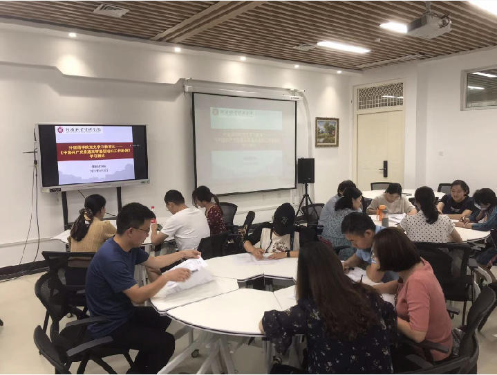 随后外语学院教工党支部书记闻华和张静同志分别领学了《中国共产党普通高等学校基层组织工作条例》。在条例学习中,王书记强调,新修订的《中国共产党普通高等学校基层组织工作条例》是以习近平新时代中国特色社会主义思想为指导,以党章为根本依据,落实新时代党的建设总要求和新时代党的组织路线,对高校基层党组织工作作出全面规范,是新时代高校党的建设的基本遵循。《条例》体现了党的理论创新、实践创新、制度创新的最新成果,吸收了各地各高等学校党的建设的新经验,是高等学校党务工作必须遵循的基本规章。全体党员教师要充分认识学习条例的重要性,既要学好,又要学深,全面掌握基层党组织在政治、组织、理论、实践、制度层面的各项规定和要求,切实提高政治素质和业务能力。王书记要求大家认知体会学习,随后将对相关条例的知识学习进行测试和座谈。