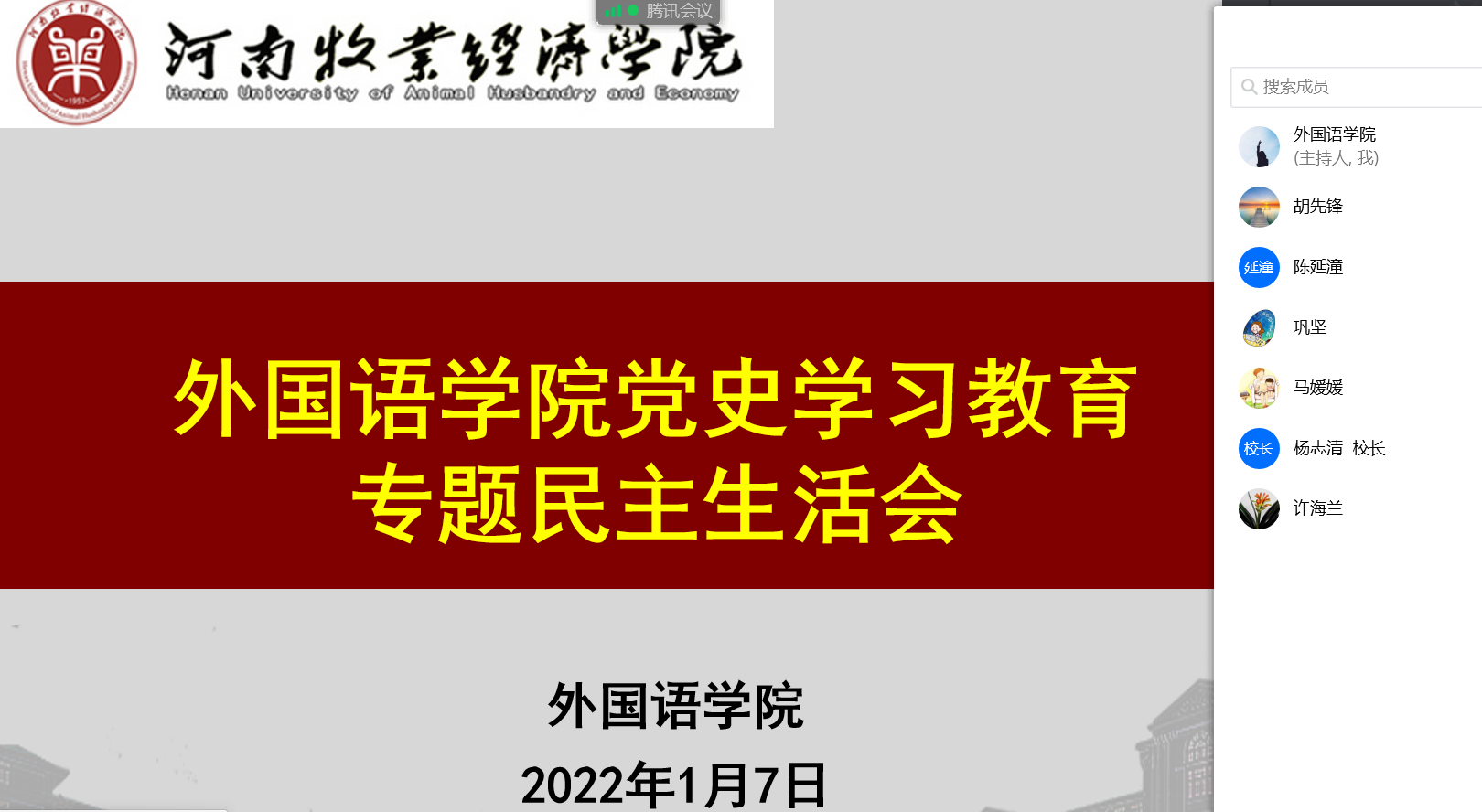 1月7日下午,按照学校党委统一安排和部署,今年会官方网站以线上视频方式召开党史学习教育专题民主生活会,副校长杨志清全程参会指导并作点评讲话。会议紧扣“大力弘扬伟大建党精神,坚持和发展党的百年奋斗历史经验,坚定历史自信,践行时代使命,厚植为民情怀,勇于担当作为,团结带领人民群众走好新的赶考之路”的主题,紧密联系院党委领导班子建设情况,联系班子成员个人思想和工作实际,深入查摆问题,剖析思想根源,开展批评和自我批评,提出改进措施,明确今后努力方向。院党委书记胡先锋主持会议。