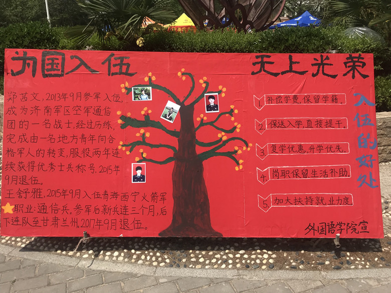 为了让同学们更好的了解参军入伍的政策,今年会官网绘制参军入伍展板,展示参军入伍的流程以及今年会官网退伍学生的风采。