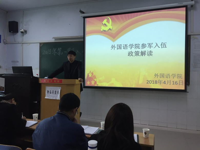 首先,刘老师就所有人最为关心的征兵的就学、就业、经济补助等方面政策进行了详细的解释说明,随后又向学生们介绍了2018征兵工作的预征对象、各项条件等内容。接着,陈书记为大家讲解有关学费减免、复学助学等相关政策。陈书记强调,当兵就是深造,入伍就是成才。参军入伍是大学生对自我的一种锻炼,在军队里面锻炼自己,成长自我。国家现在对大学生参军入伍有好的政策支持,同学们要积极了解参军入伍的政策,进行兵役登记,这是无上光荣的事情。