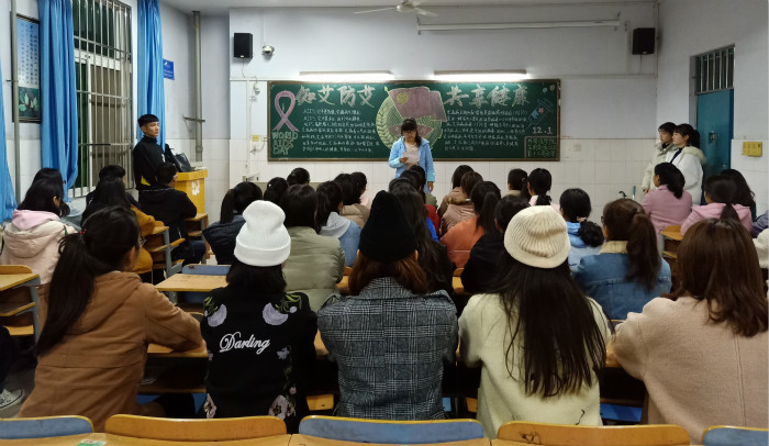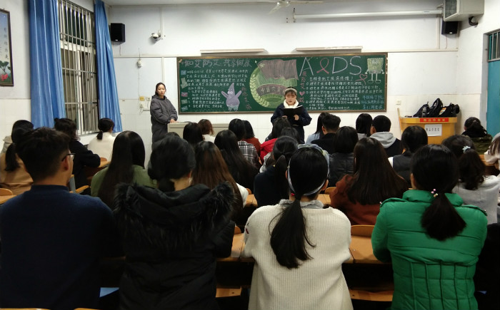 各班认真准备,积极组织,形式多样。18级旅游英语二班通过问题抢答的方式向同学们普及艾滋病的基础知识,如艾滋病是什么、传播途径、预防措施、红绸带的含义、健康的生活方式有哪些等问题,同学们积极回答,在互动的同时充分了解了艾滋病的现状。18级商务英语一班团支书重点给大家讲解艾滋病的传播方式,大致有三种,主要为性接触,血液和母婴。大家还讨论了艾滋病的预防措施,有的同学说到要洁身自好,遵守健康的生活方式,构建积极的人际交往;还有的同学提醒大家:公用注射器是传播艾滋病的重要途径,因此大家在义务献血时也要选择正规医院,做好事的同时也要保护自己。18级应用英语一班的同学围绕艾滋病病人的现状展开讨论。大家都认为,对艾滋病人来说,她们不仅遭受了病痛的折磨,还遭受了别人异样的眼光,所以我们应该以平等的心去看待艾滋病人,让他们感受到社会的关爱,燃起对生活的信心。