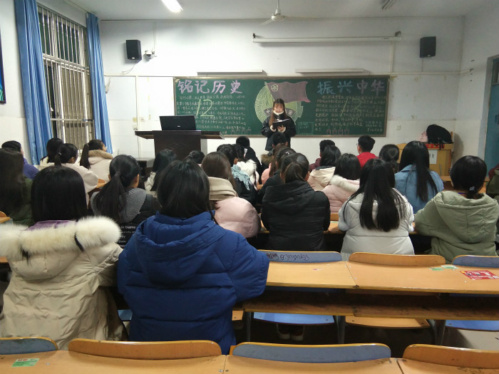 18级商务英语二班的团支书为同学们播放有关爱国的歌曲《国家》,同学们心情澎湃的演唱。如歌曲描述一样有国才有家,只有国泰民安,社会繁荣发展,家才会幸福快乐。通过同学们喜爱的方式,同学们深刻认识到铭记历史,振兴中华的重大意义。旅游英语二班团支书为同学们详细的讲述南京大屠杀这段血腥的历史,“日本有计划、有预谋的大屠杀和放火、抢掠等暴行……”。同学们聚精会神的听着,为那些在战争中无辜丧命的同胞而悲伤,对日本惨无人道的行为感到气愤。通过叙述这段历史,同学们加深了对这段历史的印象,同时激起同学们强烈的民族使命感和责任感。进入应用英语二班的团课教室时,团支书正在演讲:“振兴中华,对于今年会官方网站的我们来说,是好好学习汉语和英语。通过我们的努力,让汉语走的更远,让中华文明传播的更广。”振兴中华并不是那么遥不可及,在同学们的大学生活中就可以做到,如奋发学习,将个人理想融入祖国和民族的前途命运中,主动承担大学生的社会责任;关注国际新闻,了解当今国际政治;参加学校、社会志愿服务活动,在奉献中实现自己的价值等。