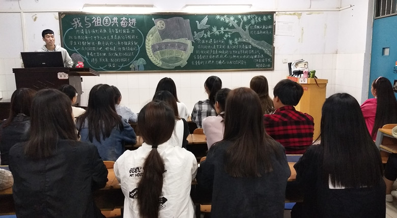 团课上,各班开展了形式多样的主题活动。17级应用英语一班别出心裁,全体同学集体朗诵《我的祖国》。“我的祖国,高山巍峨,雄伟的山峰俯瞰历史的狂风雨落,暮色苍茫,任凭风云掠过,坚实的脊背顶住了亿万年的沧桑从容不迫。”激情澎湃的诗句让大家感受到了祖国的雄伟与壮丽。17级商英一班的彭文丽同学讲解了建国以来,中国一路艰辛坎坷的发展历程,并为同学们推荐了电影《建国大业》。17级旅英一班的何慧同学讲述了中国近年来在经济、科技、文化等方面取得的巨大成就,同学们不禁感叹祖国的强大,纷纷表示要不断拼搏进取,为实现中华民族伟大复兴的中国梦而努力。