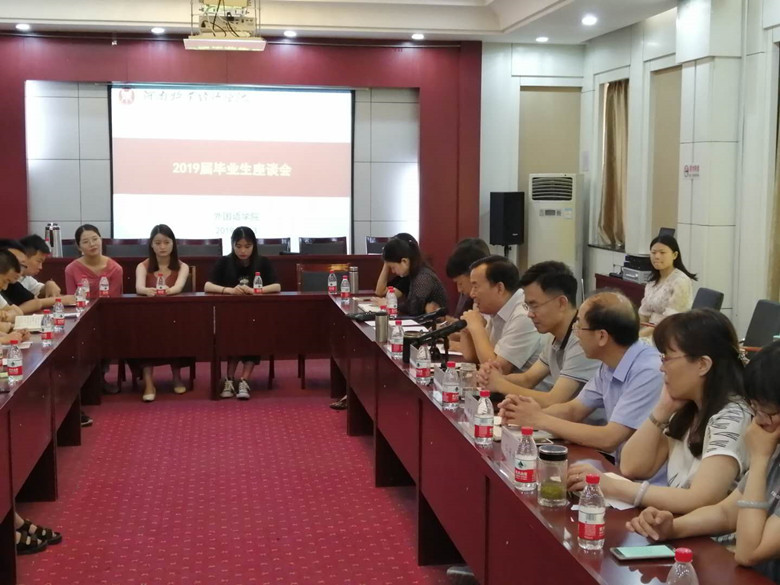 夏木繁盛,鸟语蝉鸣,在这美好的季节,我们欢聚一堂话别离。6月13日,今年会官方网站举办了2019届毕业生座谈会,今年会官网党总支书记弓峰山、院长陈延潼、党总支副书记陈东景、副院长郑长发、副院长马媛媛,各教研室教师代表、辅导员老师以及19届毕业生代表参加了座谈会。会议由陈东景副书记主持。
