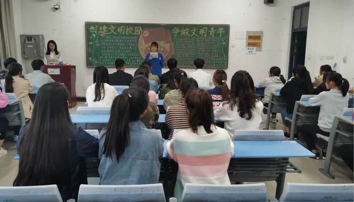下午2点30分,各班团课准时开始。走进2019级商务英语三班,班长正以饱满的情绪、洪亮的声音带领同学们学习《学生手册》,同学们坐姿端正,认真聆听,深入学习学校各项管理规章制度。同时,同学们针对如何为创建文明校园献出自己的一份力量,纷纷发表了自己的看法。有同学谈到:“文明是中华民族的传统美德,是我们素质的基本,是一种良好的习惯。”旅游英语专业的团支书通过放映与文明相关的影片、视频片段把文明行为更形象地展现出来。同学们聚精会神地观看,更加全面地了解了文明青年应该具备的品质。同学们一致认为要提高自身的文明素质,并落实到日后的学习生活中,譬如同学有困难,主动伸出援助之手,给予帮助;在大学生活中,努力学习,不断提高自身的文化水平,增强明辨是非的能力,以积极乐观的心态迎接未来。
