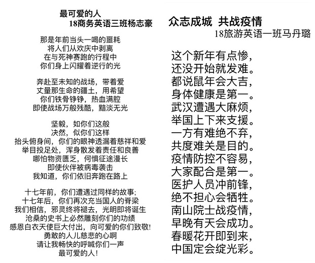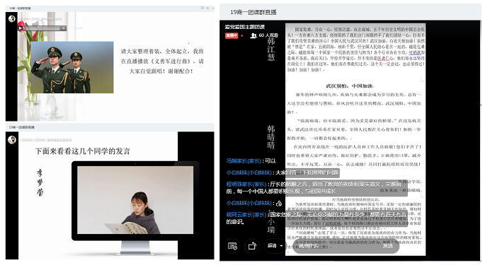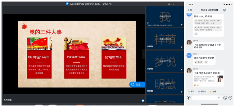 团课伊始,各团支部开展了特殊的网上升旗仪式。同学们面向直播中的国旗肃立,听指挥高唱国歌,向祖国母亲致敬,向抗疫英雄致敬,为中国加油!接下来各支部以“爱国主义的硬核力量(The Sheer Force of Patriotism)”为关键词开展团课学习。19商英01团支部组织大家观看了厦门大学美籍教授潘维廉谈及自己在面对这场疫情时的真实感受的采访视频。潘教授从一名美国知识分子的视角,以他的科学理性和丰富阅历高度赞扬道,中国政府为抗击疫情所展现的公开、透明、高效和负责是世所罕有的。同学们纷纷表示经历了这次疫情防控阻击战,更加深切地感受到中华民族的伟大精神和国家的强大力量,也深刻地意识到作为新时代的青年和公民,应该敬畏生命、增强规则意识、学会感恩,肩负起青年的责任和使命,更好地去关爱社会、关爱他人、报效祖国。19商英02团支部组织大家观看了纪录片《辉煌中国之开放中国》,影片讲述的中国故事、刻画的中国面貌、展现的中国变化、传递的正能量无不令人振奋、备受鼓舞。在连麦环节,大家说的最多的一个词就是“厉害了,我的国!”19商英03团支部组织大家学习了《光辉历程:中国共产党党史的基本脉络解读》、爱国教育宣传短片《我和我的祖国》、《毫不放松抓防控统筹协调谋发展——习近平总书记在统筹推进新冠肺炎疫情防控和经济社会发展工作部署会议上的重要讲话》,通过学习党史、国史,知史爱党,知史爱国,进一步激发了同学们的爱国之情,强化了爱国之志。19应英01、19旅英01团支部通过爱党爱国知识竞答的形式,让同学们更好地了解党与国家的知识,明确人生理想与目标,强化团员的光荣感、责任感,增强团员意识。各支部还开展了战疫优秀网络文化作品展示活动,以诗歌、文章、绘画、视频等形式讴歌抗击疫情的时代英雄,传递“同舟共济、攻坚克难”的正能量,为武汉加油,为中国加油。最后,19商英01班团支书张雨微借用国务委员兼外交部长王毅的讲话对本次团课做总结,“Winter will eventually pass, and spring is sure to come.Just as President Xi Jinping said, we have full confidence, capacity and determination to defeat the epidemic. Dawn is breaking and we are seeing light coming through.”(没有一个冬天不可逾越,没有一个春天不会到来。正像习近平主席所说,我们完全有信心、有能力、有把握战胜这场疫情。黎明,正在到来;曙光,就在前方。)