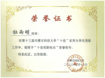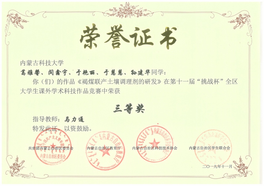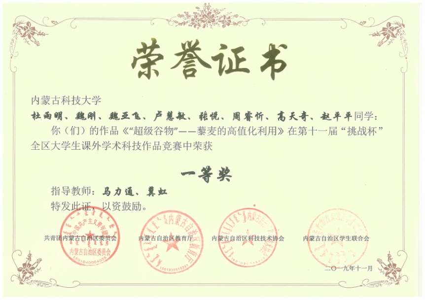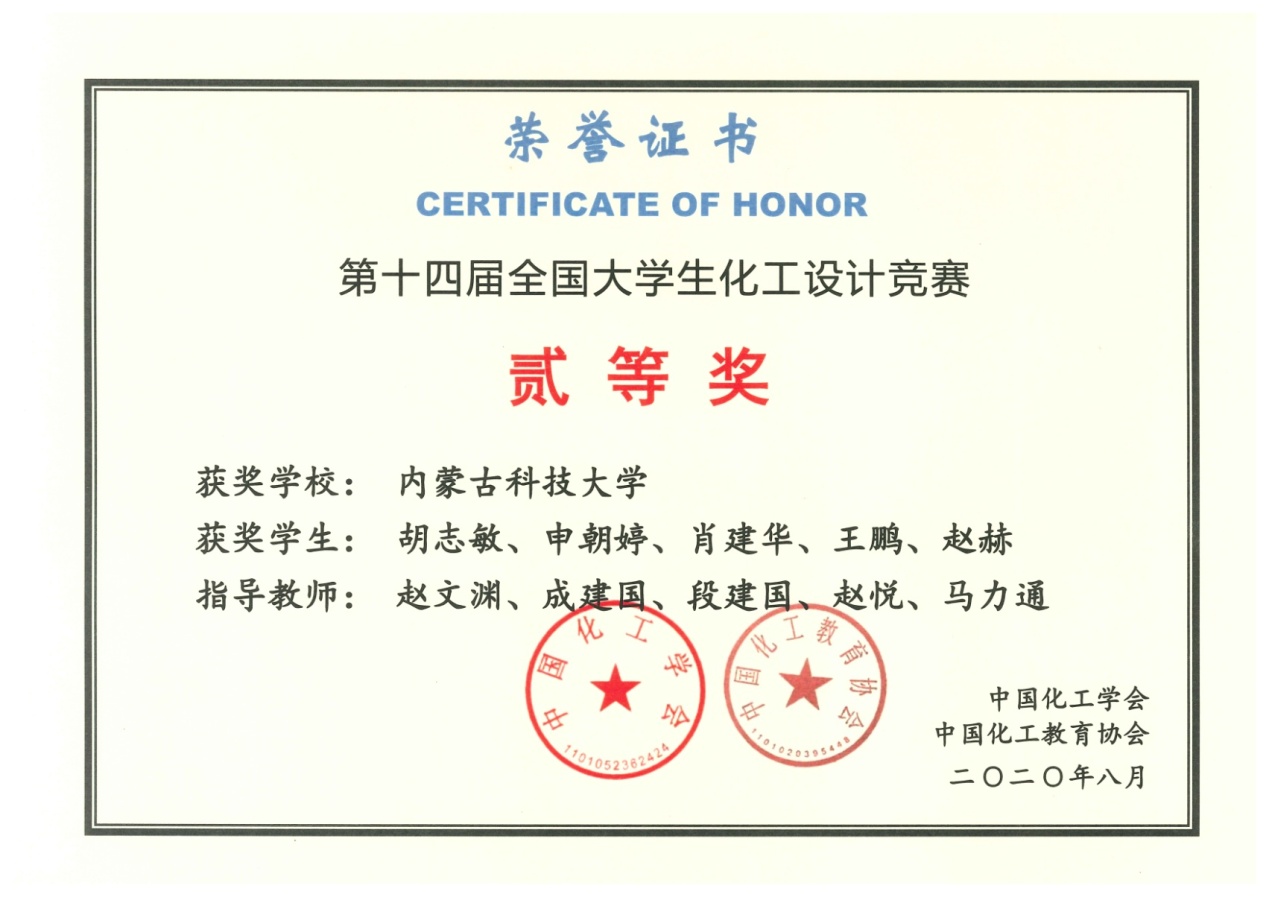 轻化工程专业鼓励教师做学生创新思维的引导者,将学生的培养引入教师的发展中来。学生创新创业的成果屡获佳绩,2019年在第十一届“挑战杯”自治区大学生课外学生科技作品竞赛中,荣获一等奖2项、三等奖1项;荣获内蒙古自治区级大学生创新创业训练计划项目(201910127009)1项,第八届“创青春”包头市青年创新创业大赛荣获铜奖1项。2020年新冠疫情阻挡不了轻化工程专业前进的脚步,由轻化2016级毛京伟、王佳乐和轻化2017级胡智敏、申朝婷、肖建华、王鹏、赵赫组成的六氯环己烷团队,首次参加2020年“齐鲁石化杯”第十四届全国大学生化工设计竞赛,取得了全国二等奖(华北赛区一等奖)的好成绩;荣获国家级大学生创新创业训练计划项目(202010127001)1项,2020年自治区级大学生创新创业训练计划项目(202010127018、202010127028)2项,第六届内蒙古自治区“互联网+”大学生创新创业大赛自治区银奖1项,第十届全国大学生电子商务“创新、创意及创业”挑战赛内蒙古赛区省级选拔赛二等奖1项。