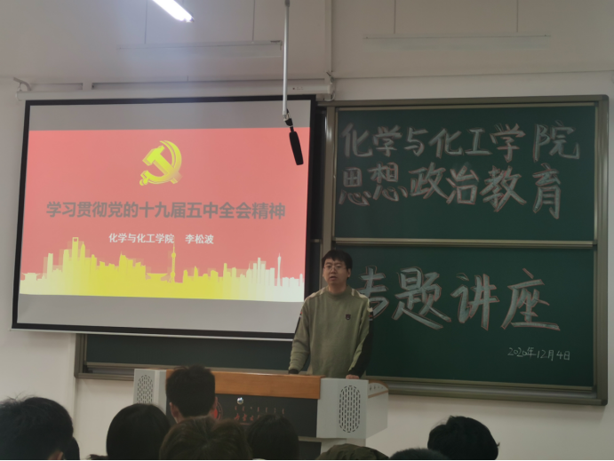 2020年12月4日,yl6809永利官网在明德楼H108开展思想政治理论课专题讲座。本次讲座主题为:学习贯彻党的十九届五中全会精神,主讲人:yl6809永利官网党总支书记李松波。