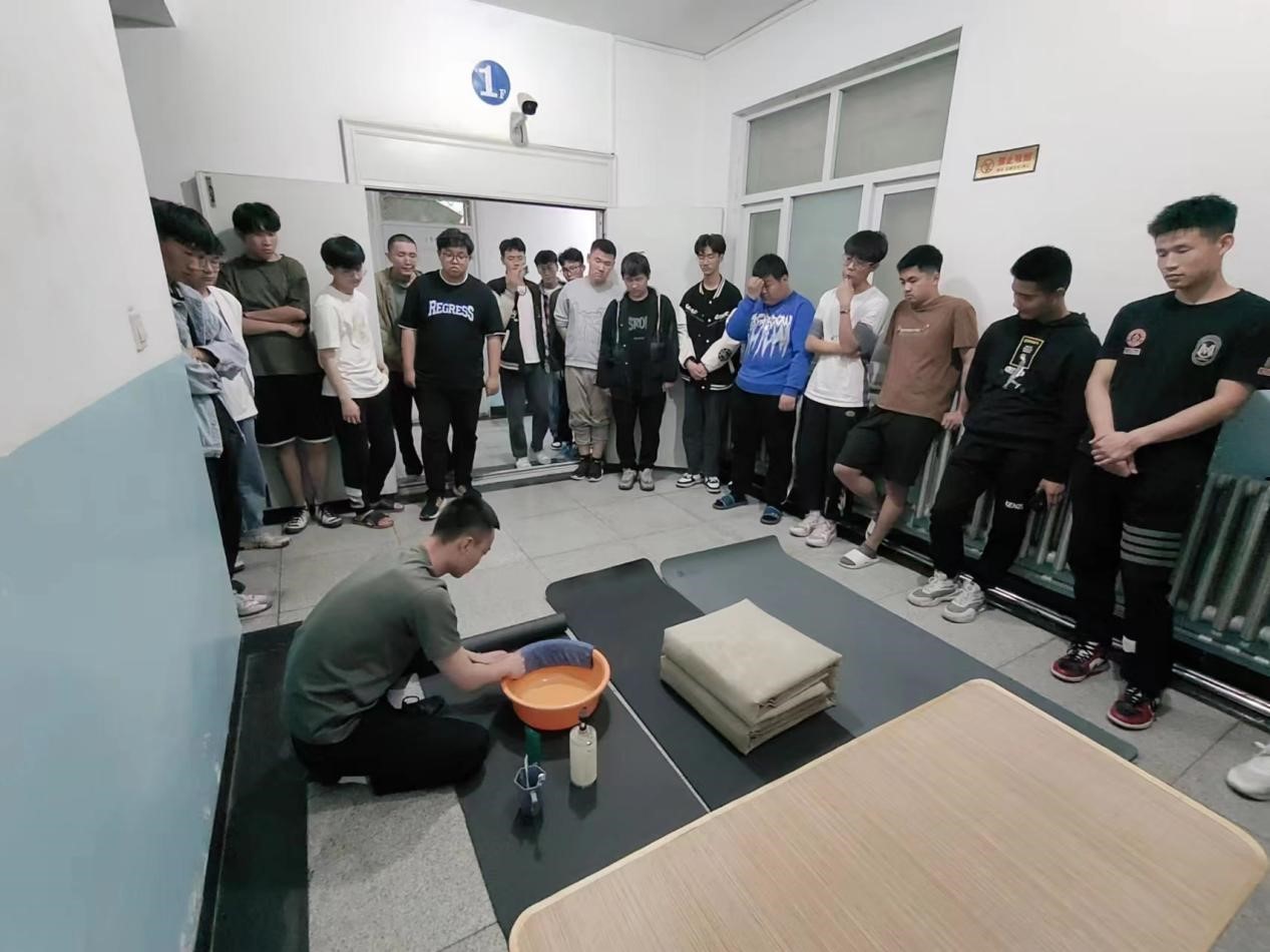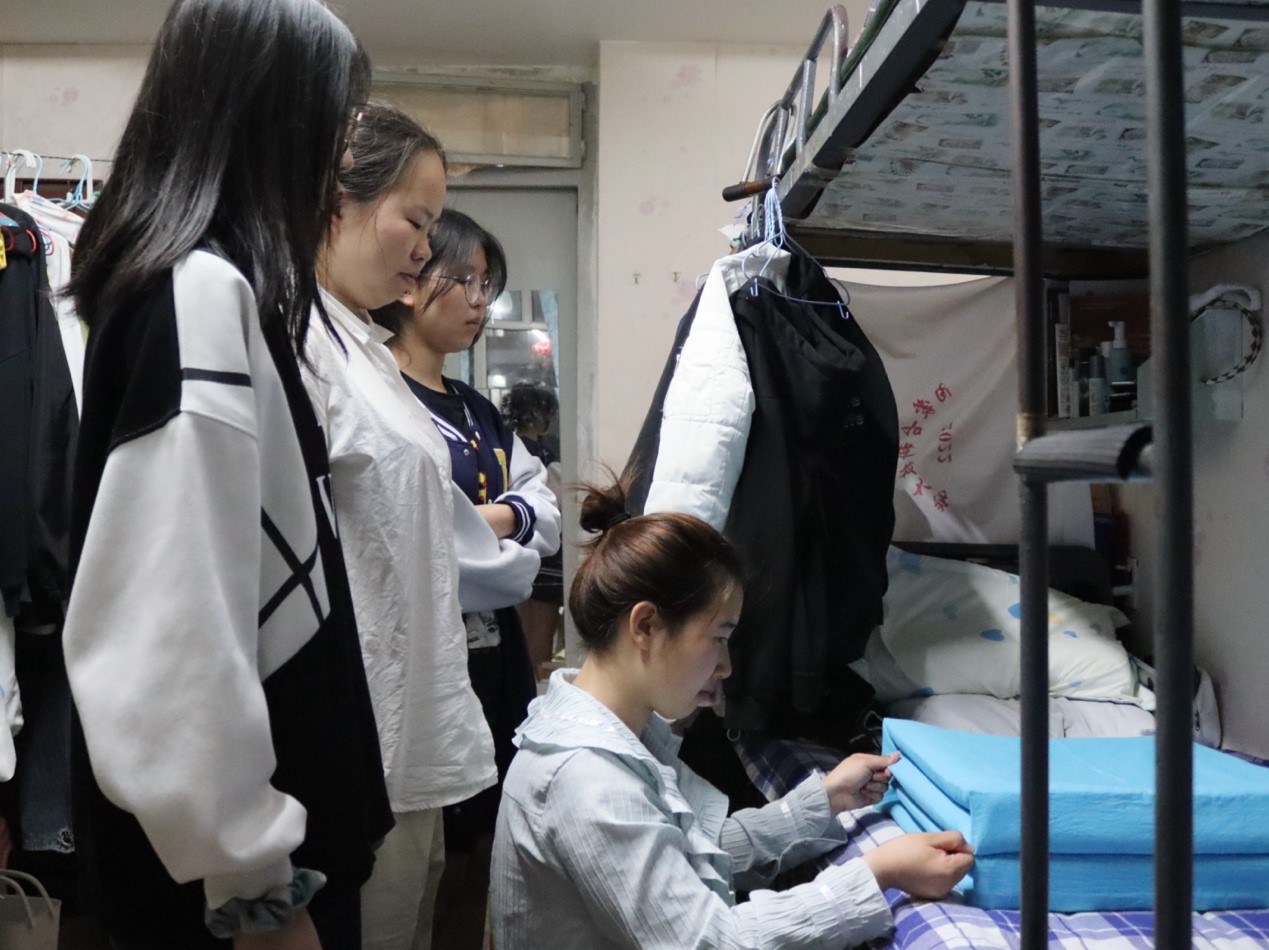 本次活动分别在26#男生宿舍楼和5#女生宿舍楼内进行,八名退伍大学生分批次为同学门示范了内务整理要点,在被子的折叠和摆放位置、床铺整理、生活用品的规范摆放、室内整体清洁标准等方面进行详细讲解。他们边操作边讲解,熟练而精准地借助 “压、折、挤、掏”等基本动作完成了从棉被到“豆腐块”的华丽转变,赢得了同学们的称赞。学习过程中,同学认真聆听,并按照要求在宿舍进行了整理,内务整理工作初见成效。
