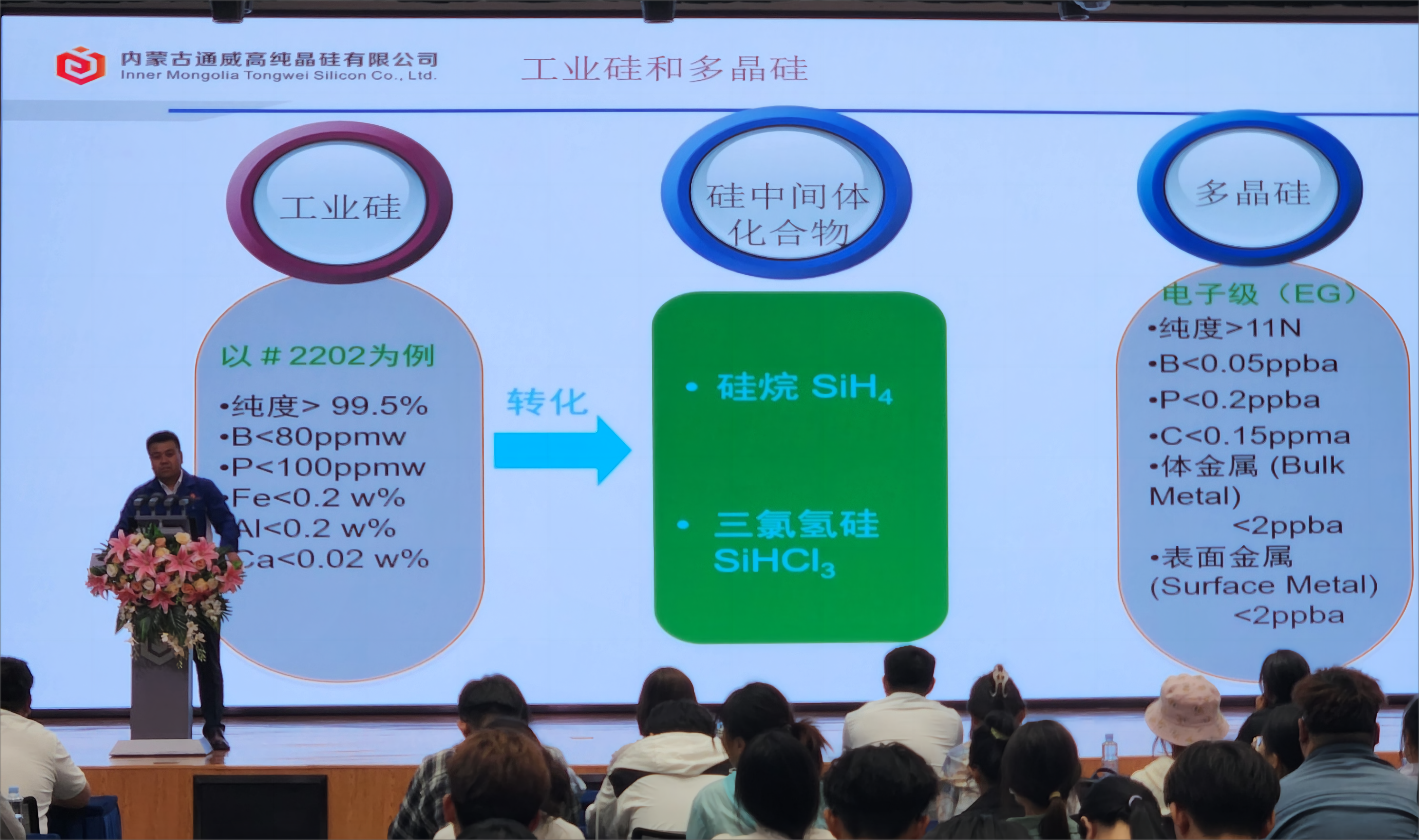 5月23日下午,硅业学院能源化学工程专业2022级全体同学来到内蒙古通威高纯晶硅有限公司,开展了《新能源技术前瞻》课程的又一次学习。课程包括实地参观学习、专业授课和企业人才培养模式介绍等三部分。在厂区参观环节,学生们参观了高纯晶硅企业的生产和中控现场,对高纯晶硅产业有了更为深入地了解。专业授课环节特邀到了内蒙古通威高纯晶硅有限公司生产部田志飞部长进行《多晶硅生产工艺》教学。田部长作为yl6809永利官网杰出校友代表,多年深耕于高纯晶硅工艺优化与研发一线。他结合自己多年的生产实践经验,为同学们详细讲授多晶硅生产工艺的具体流程和技术需求,着重分析了《分离工程》《化工原理》等本科专业课程在多晶硅生产工艺实践中的重要地位和紧密联系,倡导同学们要重视本科专业学习,学好、学活专业课。在企业人才培养模式介绍环节,人事行政部副部长周美香为同学们介绍了通威的人才发展路径和具体案例。在整个见习与授课过程中,同学们更详细地了解了多晶硅生产工艺的具体流程和现场生产环节,也更加明晰了通威的人才培养模式,对未来的职业发展和规划有了清晰的方向。