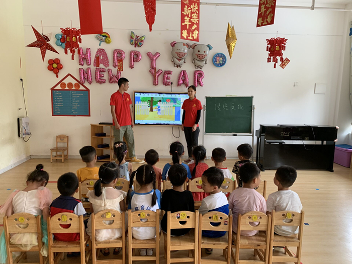 队员们选择了《三字经》、《弟子规》等经典传统文化启蒙读物,并辅助动画播放,小朋友们学习热情很高,通过学习让中华的传统文化在小朋友们心中潜移默化地生根发芽,让传统文化得以传播。同时,在实践活动期间,队员们跟着幼儿园的江园长学习传统民族乐器,自身也受益不少。