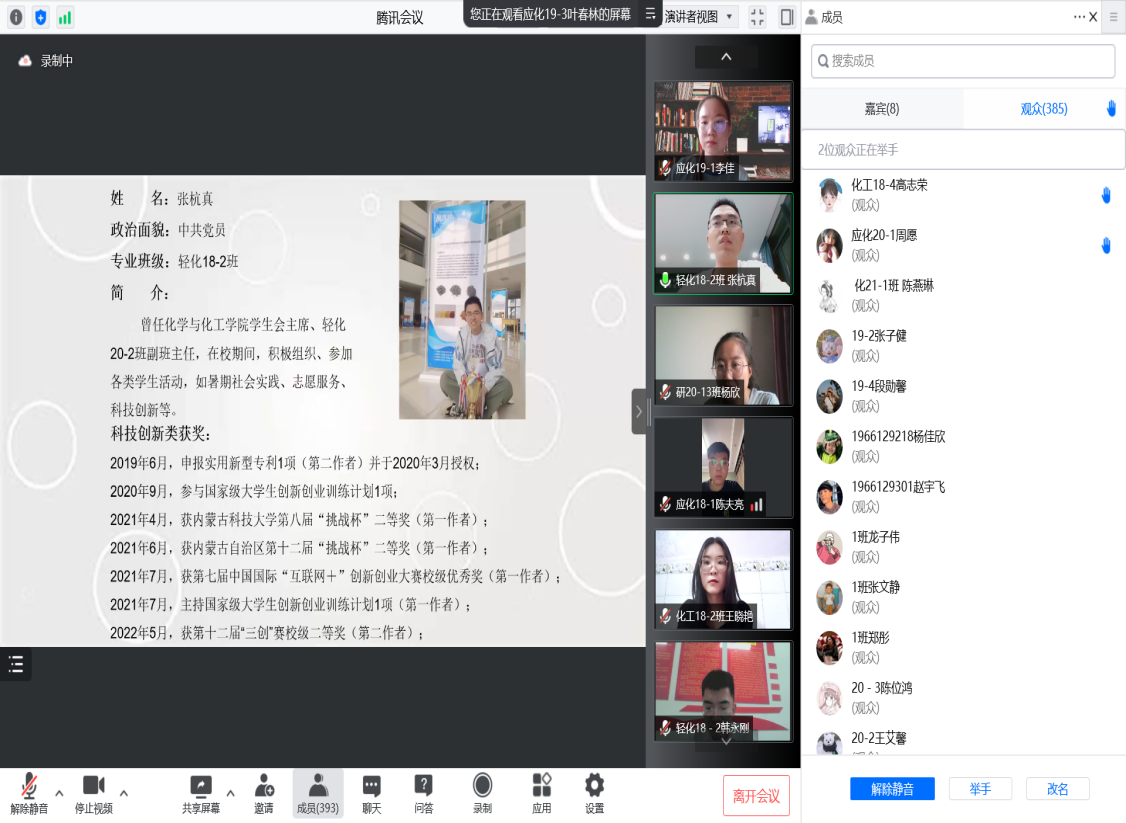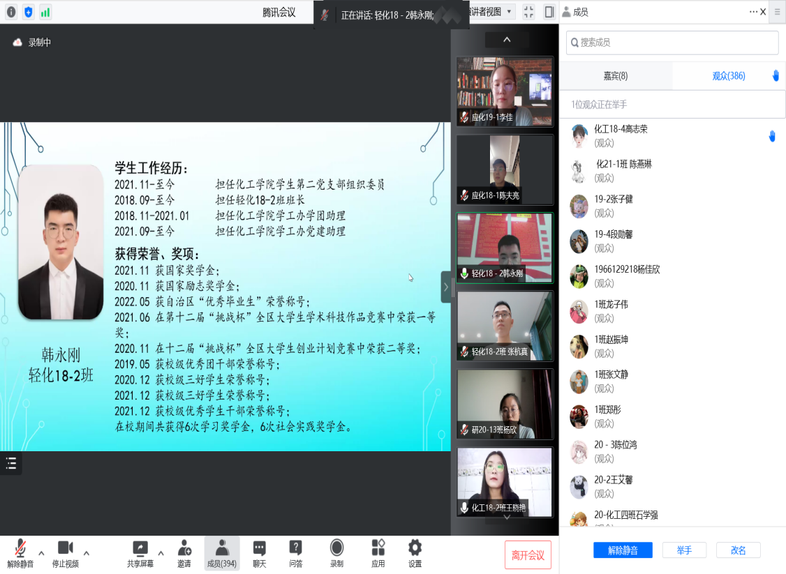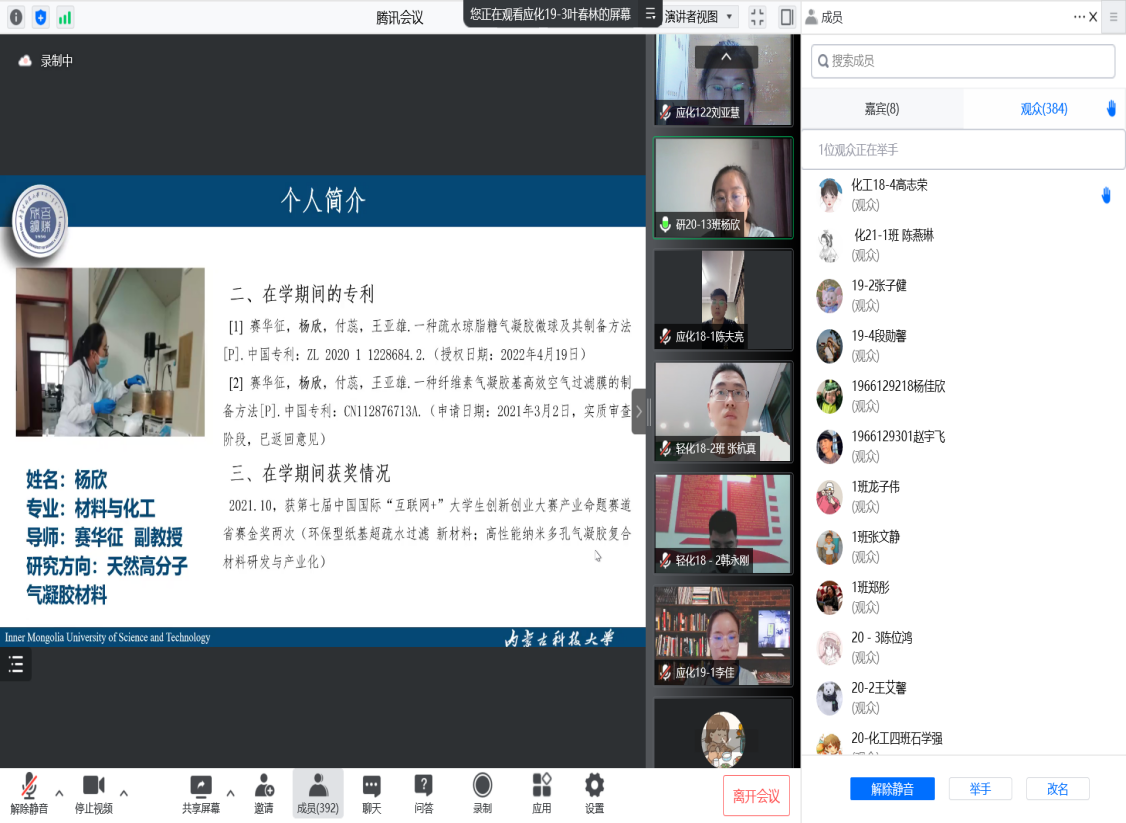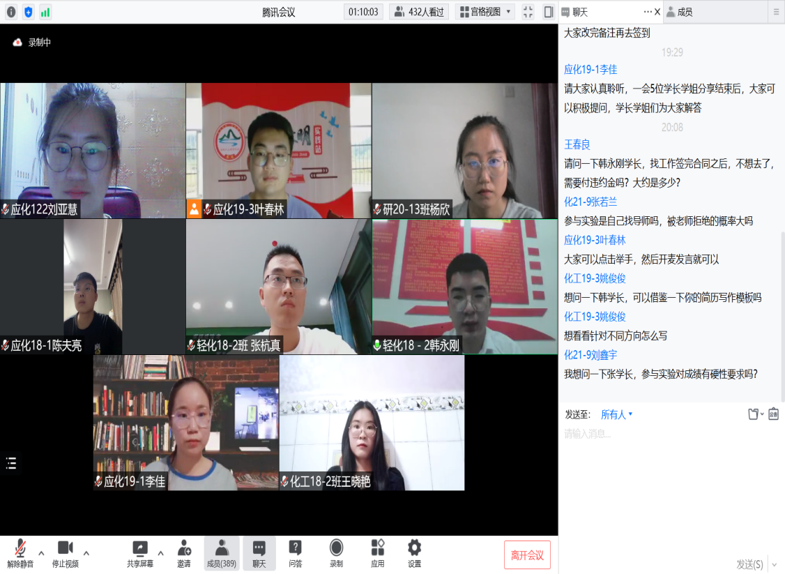 会上,自治区级“优秀毕业生”韩永刚、保送至中国石油大学化学工程与技术专业读研的陈夫亮、自治区级“优秀毕业生”张杭真、保送至天津大学化学工程专业读研的王晓艳,以及发表过多篇SCI论文、多次参加科技创新竞赛并获奖的研究生杨欣,分别从学习、工作、科技创新、就业等方面进行事迹分享。之后同学们就专业课程学习、考研复习、简历制作以及参加科技创新大赛注意事项等方面提出问题,五位宣讲同学予以认真解答,使同学们明确了今后努力的方向。