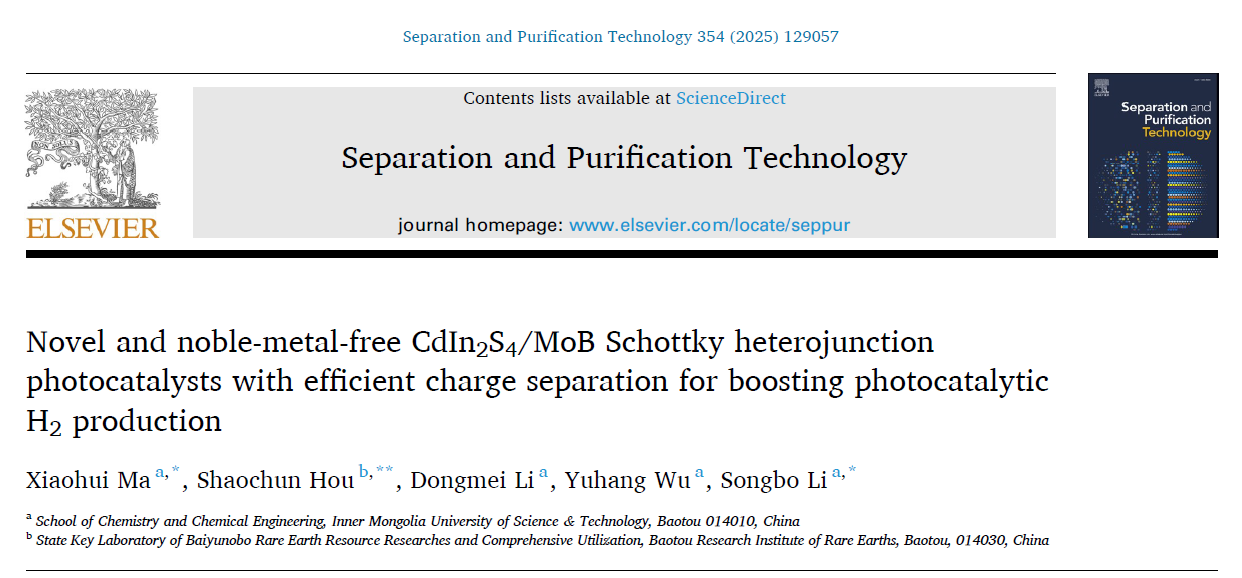 近日,永利官网马晓辉博士在国际TOP期刊Separation and Purification Technology上发表题为“Novel and noble-metal-free CdIn2S4/MoB Schottky heterojunction photocatalysts with efficient charge separation for boosting photocatalytic H2production”(Sep. Purif. Technol. 354 (2025) 129057)的重要研究成果。马晓辉博士为该论文第一作者兼通讯作者,永利官网李松波教授和包头稀土院侯少春所长为共同通讯作者,yl6809永利官网为本论文的第一完成单位。