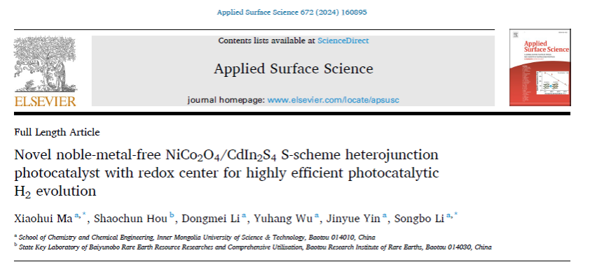 近日,永利官网马晓辉博士在国际TOP期刊Applied Surface Science上发表题为“Novel noble-metal-free NiCo2O4/CdIn2S4S-scheme heterojunction photocatalyst with redox center for highly efficient photocatalytic H2evolution”(Appl. Surf. Sci. 672 (2024) 160895)的重要研究成果。马晓辉博士为该论文第一作者兼通讯作者,李松波教授为共同通讯作者,yl6809永利官网为本论文的第一完成单位。
