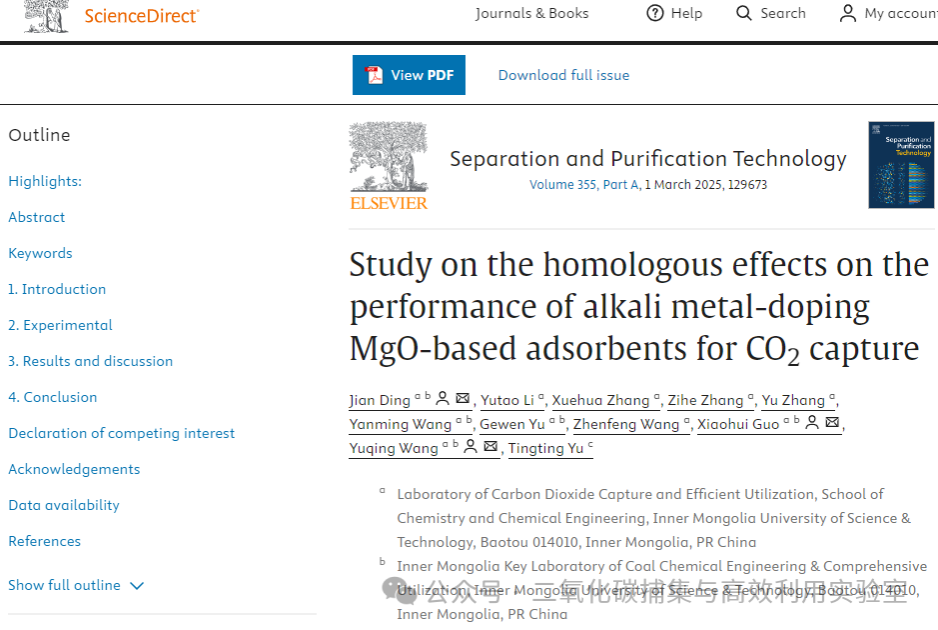 文章信息:Jian Ding*, Yutao Li, Xuehua Zhang, Zihe Zhang, Yu Zhang, Yanming Wang, Gewen Yu, Zhenfeng Wang, Xiaohui Guo*, Yuqing Wang*, Tingting Yu. Study on the homologous effects on the performance of alkali metal-doping MgO-based adsorbents for CO2capture. Separation and Purification Technology, 2025, 355, 129673. (SCI Top, IF= 8.1,1区)https://doi.org/10.1016/j.seppur.2024.129673