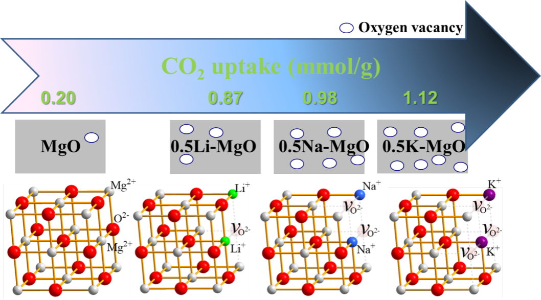 本文通过热处理含镁和碱金属的胶体前驱体制备了具有不同结构和表面性质的MgO基吸附剂。通过CO2吸附性能测试,比较了碱金属对MgO吸附剂的掺杂效果。结果表明,引入锂、钠和钾可以减小MgO的晶粒尺寸,提高碱度,特别是增加MgO表面氧空位的浓度,使更多的碱性吸附活性位点得以暴露,更有利于CO2吸附。借助N2-物理吸附、电感耦合等离子体发射光谱、粉末X射线衍射、扫描电镜、X射线光电子能谱、电子顺磁共振和化学吸附等表征技术,揭示了MgO基吸附剂的CO2吸附容量与碱金属同系效应之间的关系。CO2吸附容量随着所掺杂碱金属电子壳数的增加而增加,而这种构型有利于p轨道的供电子效应,削弱了Mg-O键强度,从而促进了晶格氧的迁移并形成氧空缺。该发现将为MgO基吸附剂的改性和性能改进提供深入的理解。