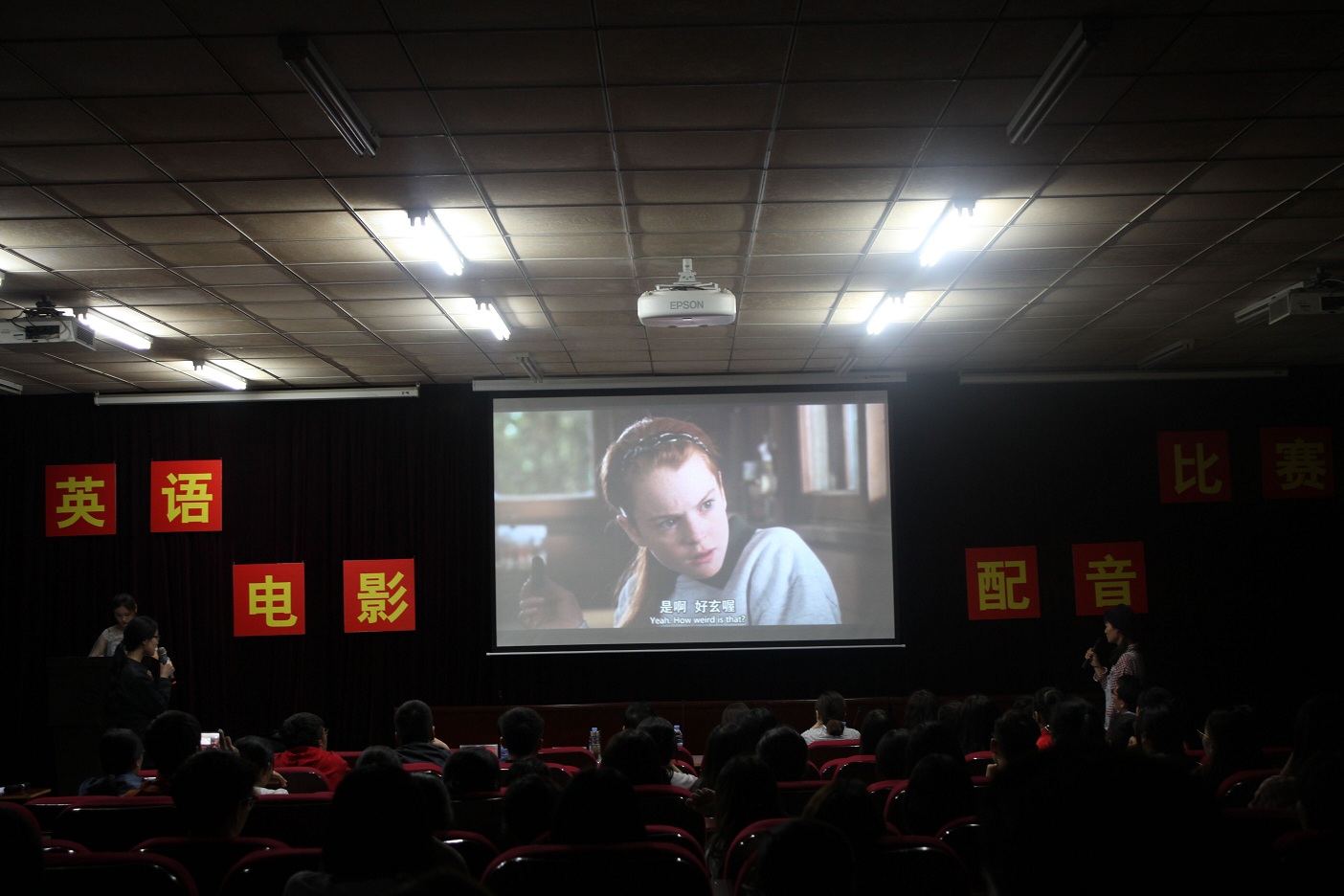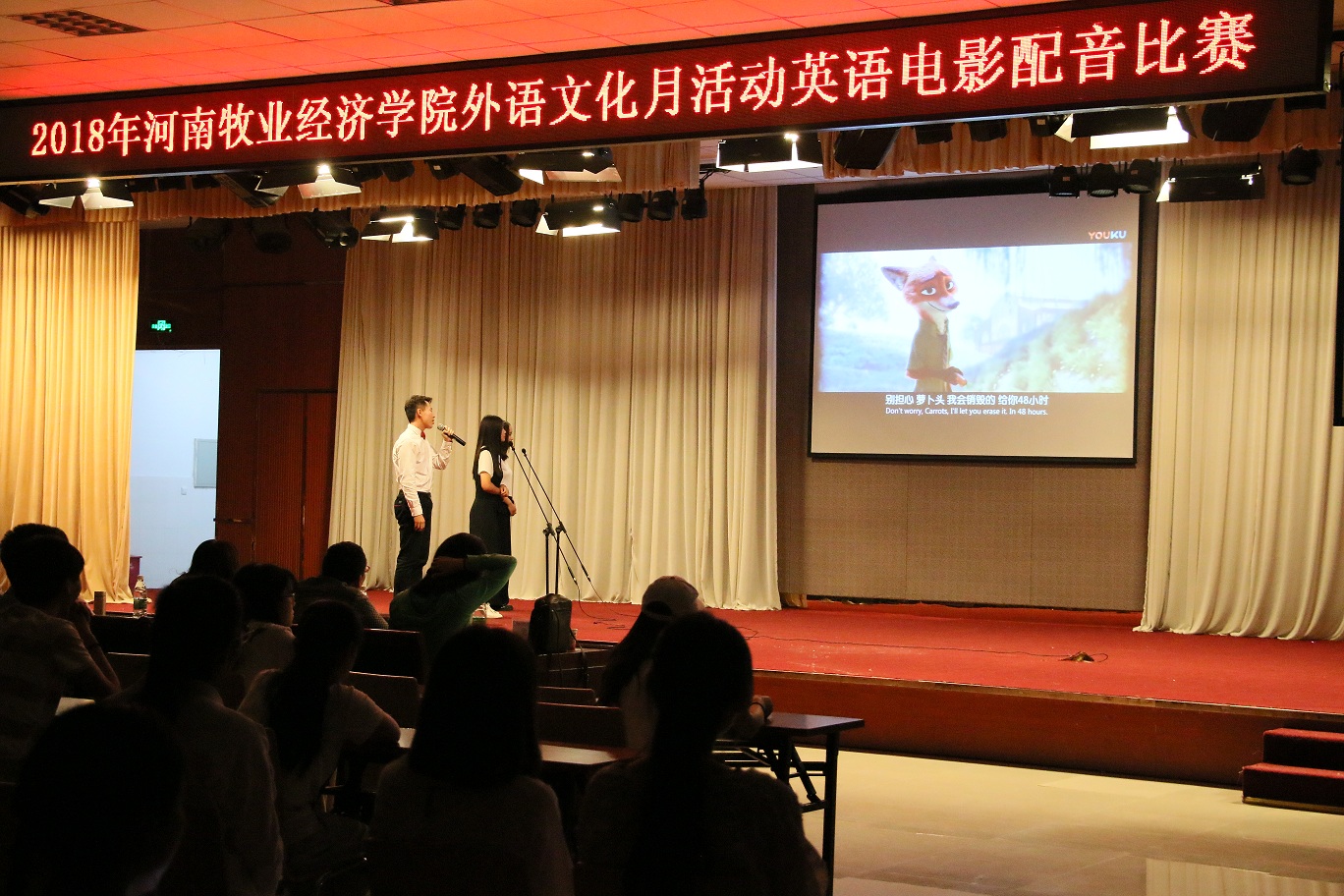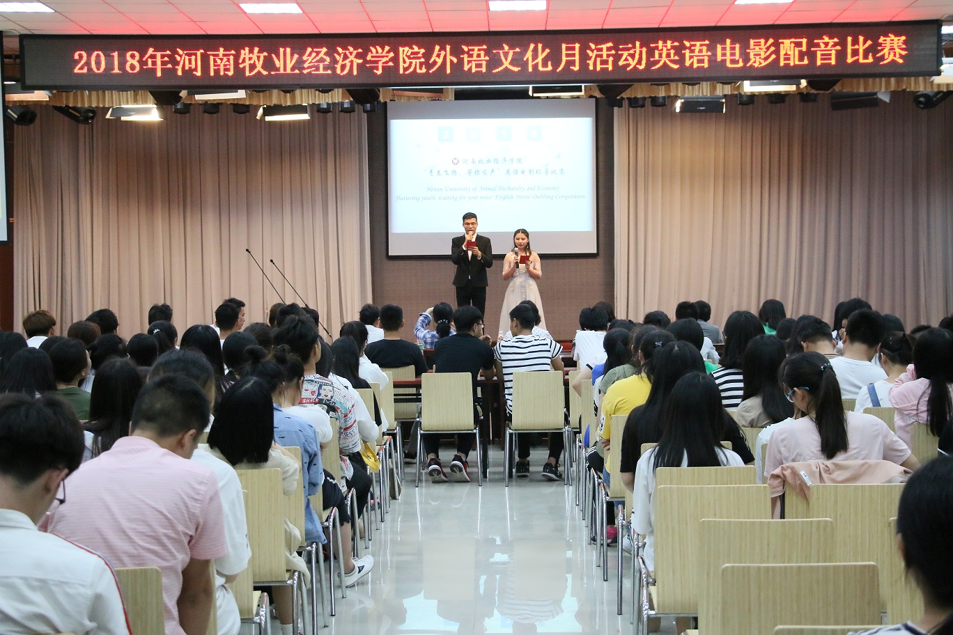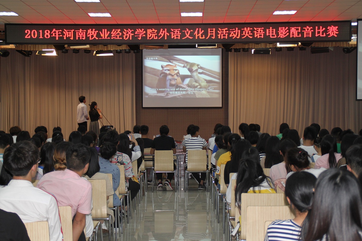 河南牧业经济学院英语电影配音比赛决赛于5月23日晚分别在英才校区E110和龙子湖校区大学生活动中心举办。比赛由学工部、校团委、今年会官方网站主办,校学生会承办。今年会官方网站副院长许海兰、马媛媛等14名老师应邀担任评委,与现场千余名学生共同观看了比赛。