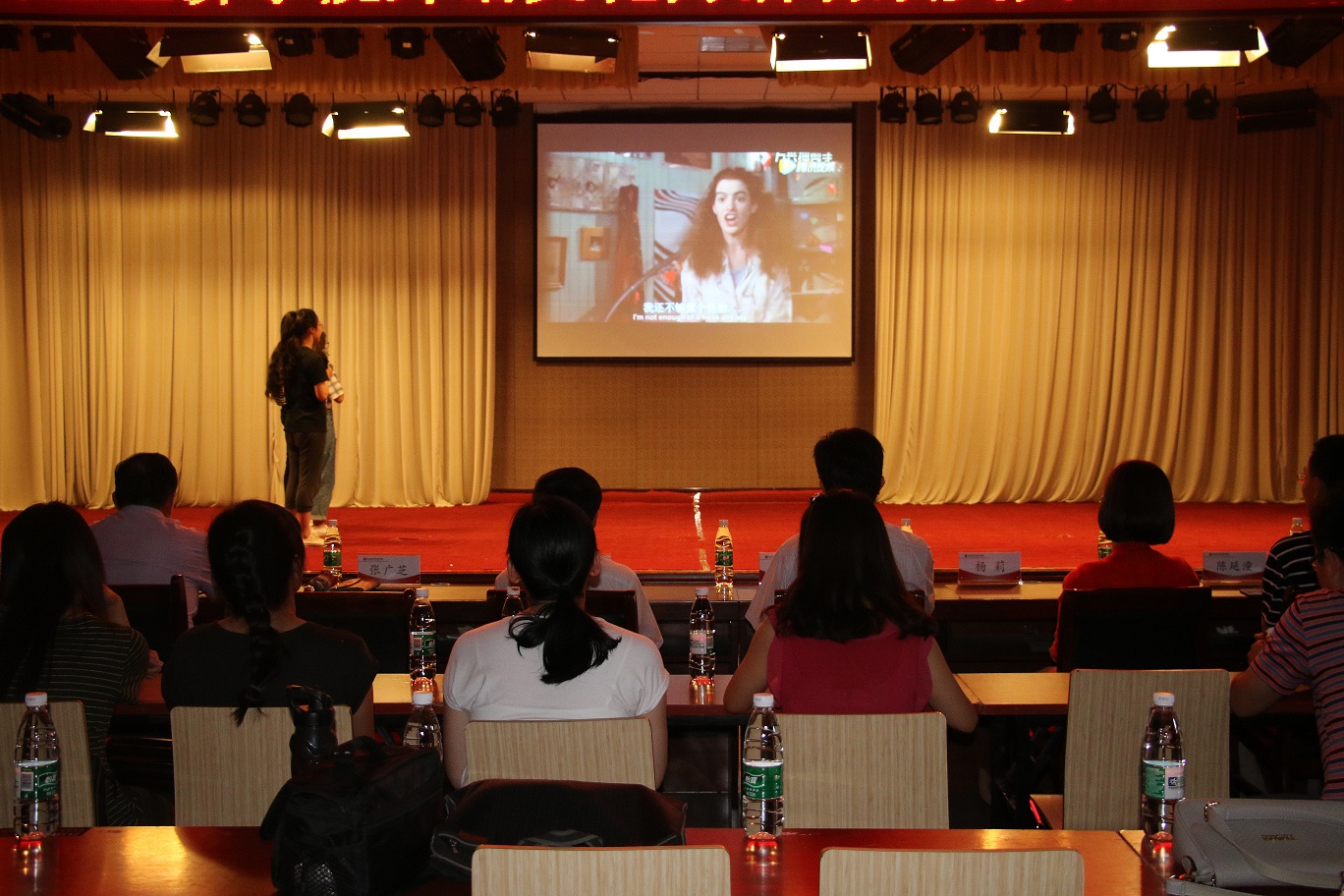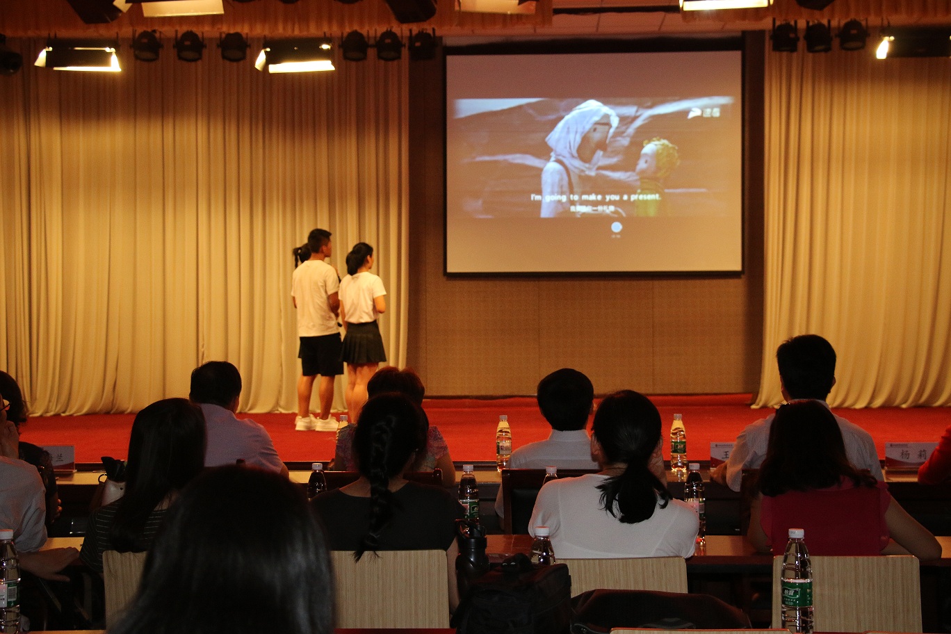 汇报演出在国际教育学院的同学们带来的电影配音表演《天生一对》中拉开了帷幕。随后各项赛事的颁奖仪式与获奖选手的演出穿插进行。有经济贸易学院、工程管理学院选送的《公主日记》配音表演,物流与电商学院的选送《小王子》配音表演,制药工程学院选送的《疯狂动物城》配音表演,艺术学院选送的《冰雪奇缘》配音表演,还有荣获全国高等院校英语导游服务三等奖的今年会官方网站旅游英语专业学生王颖颖带来的英文导游讲解----紫禁城,为观众带来了一场英语技能和英语文化的盛宴,充分展现了今年会官网大学生的英语综合应用能力,赢得了嘉宾和观众的一致好评。副校长许圣道,校党委机关工委书记王建昌,学工部部长、学生处处长张广芝,团委副书记杨莉等嘉宾领导为荣获优秀组织奖、优秀指导教师奖及各项赛事一二三等奖的获奖集体和师生颁奖。