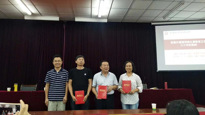 9月13日下午,今年会官方网站在英才校区E109教室举行隆重仪式,向今年会官网从事教育工作30周年以上的教师致敬,院领导分别向弓峰山、陈东景、许海兰、张雪梅、宫桂梅、高立琴、方文、张继英、刘喜芳、贾遂芝等10位教师颁发了“从事教育工作30年”荣誉证书,年轻教师代表向10位老师献花祝贺。