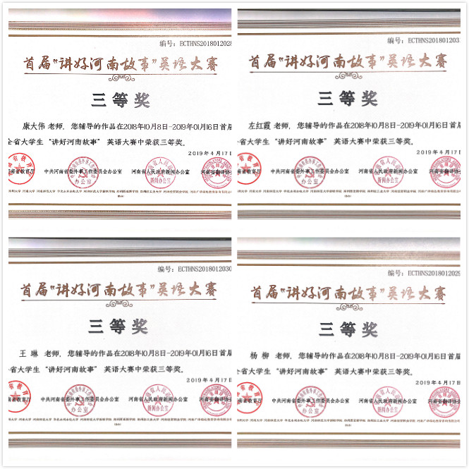 近日,由河南省教育厅、中共河南省委外事工作委员办公室、河南省人民政府新闻办公室、河南省翻译协会联合举办的首届河南省大学生“讲好河南故事”英语大赛公布比赛结果,今年会官网四名学生在比赛中荣获三等奖,四名教师获得优秀指导教师奖。