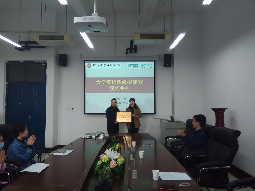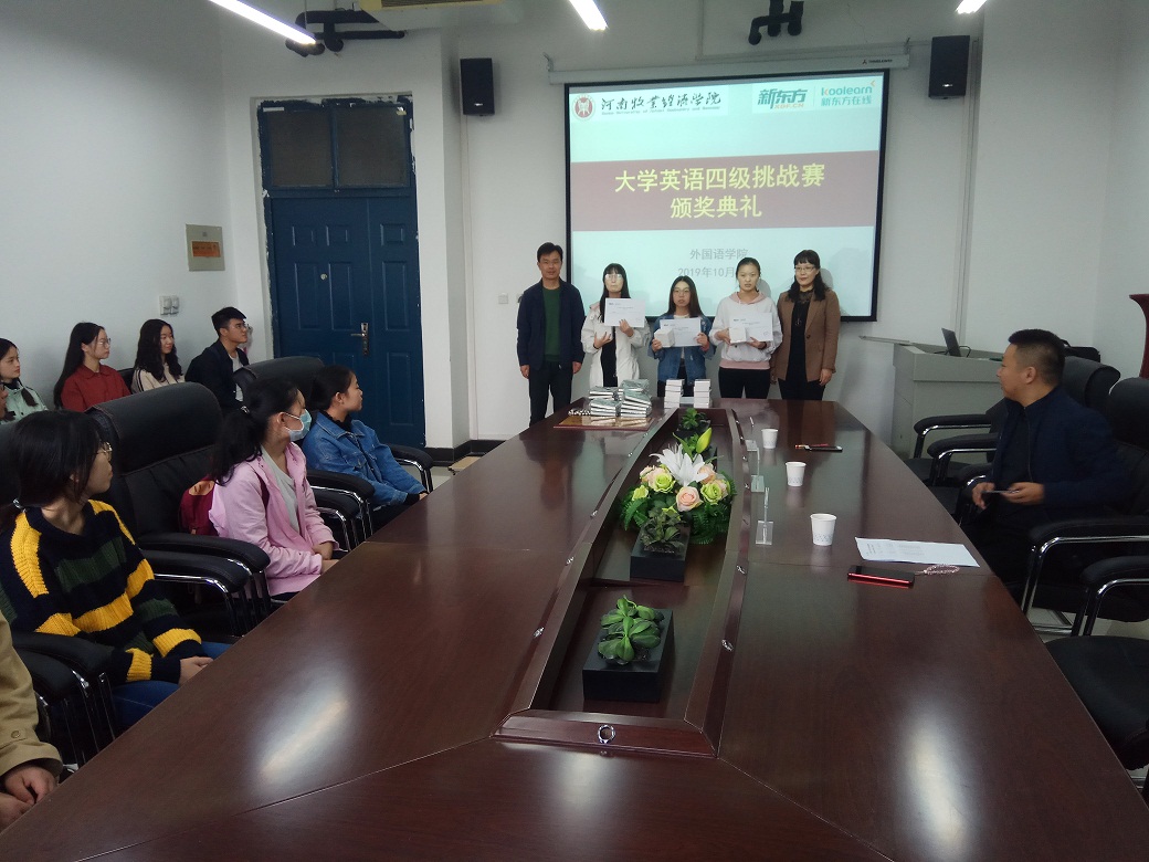 10月10日, 由新东方在线支持举办的“大学英语四级挑战赛”活动颁奖仪式在今年会官方网站举行。今年会官方网站院长陈延潼、“新东方在线”高校运营管理部助理大区总监钱硕、部分教师代表以及获奖学生参加了此次颁奖活动。