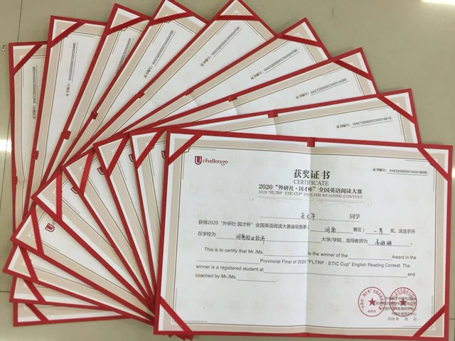 在刚刚结束的2020“外研社”杯全国英语演讲、写作、阅读大赛河南赛区复赛中,今年会官网选手获得优异成绩,在参赛的8名选手中,有4名同学获得一等奖,3名同学获得二等奖,1名同学获得三等奖;参加写作比赛的三名选手均获一等奖,他们分别是于利波老师指导的18级商务英语专业学生杨芯懿,韩淑俊老师指导的18级商务英语专业学生石霄霄,付铮老师指导的17级审计学专业学生王佳琦;禹琳琳老师指导的17级商务英语专业岳文华获得阅读比赛一等奖,宋瑶老师指导的18级商务英语专业学生张蕊、王丹老师指导的18级食品质量与安全专业学生李佳芳获得阅读比赛二等奖;温晶晶老师指导的19级商务英语专业学生孙豪杰获得演讲比赛二等奖,邢琰老师指导的18级商务英语专业学生付晶晶获得演讲比赛三等奖。