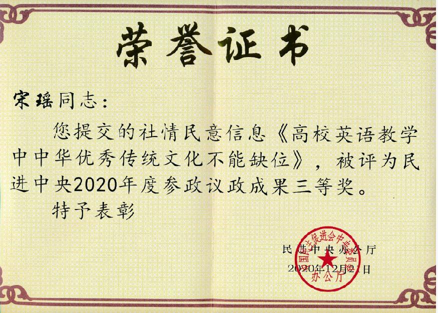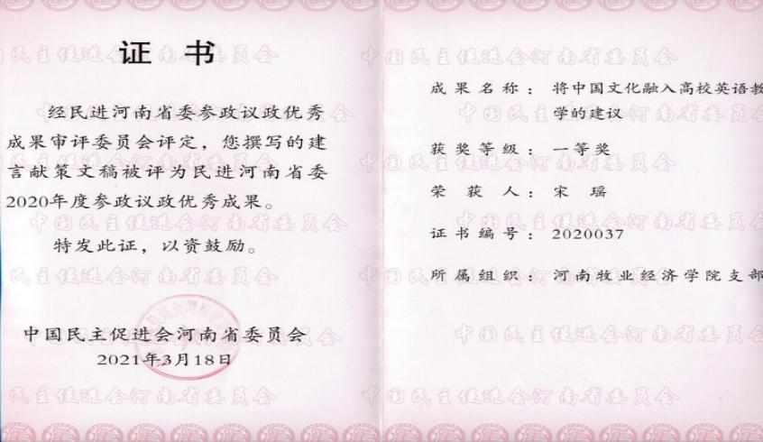 今年会官网今年会官方网站教师宋瑶老师提交的社情民意信息《高校英语教学中中华优秀传统文化不能缺位》,喜获民进中央2020年度参政议政成果三等奖,宋瑶老师在此基础上撰写的建言献策文稿《将中国文化融入高校英语教学的建议》被评为民进河南省委2020年度参政议政优秀成果一等奖。
