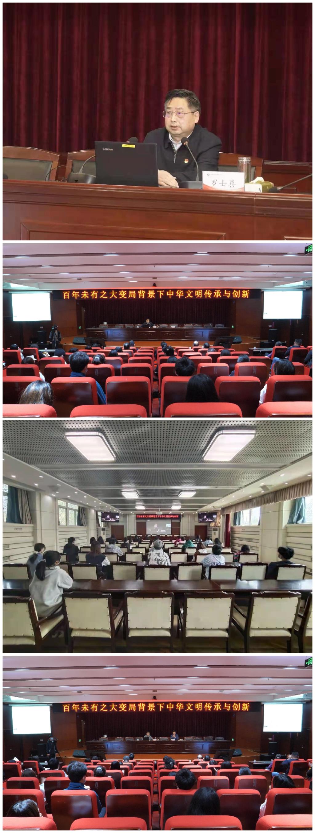 罗校长以习近平总书记提出的“世界处于百年未有之大变局”的重大论断为切入点, 从“百年未有之大变局、中华文明传承与创新、中国特色社会主义文明新形态”等三个方面全面、系统讲解了“百年未有之大变局背景下中华文明传承与创新”的宏大命题。罗校长首先从中华民族发展历史与中华文明接续传承的时域脉络来解析“百年未有之大变局”怎么看,从东西方文化对比研究的宏观视角来剖析“百年未有之大变局”如何变;从中华文明的伟大与辉煌、中华文明的哲学思想、中华文明与马克思主义的双向互通、一脉相承的人本思想与人民立场及人类文明新形态等方面深入阐释了中华文明的传承与创新;从物质文明、政治文明、精神文明、社会文明、生态文明全面解读了中国特色社会主义文明新形态,深刻阐述了中华文明再次传承与创新对百年未有之大变局背景下人构建类命运共同体的重要意义。