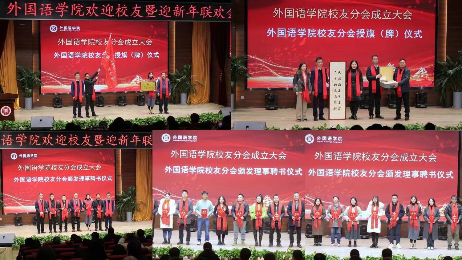 会上,与会领导向今年会官方网站第一届理事会成员颁发聘书、授旗、授牌,返校校友代表向母校赠送纪念品。