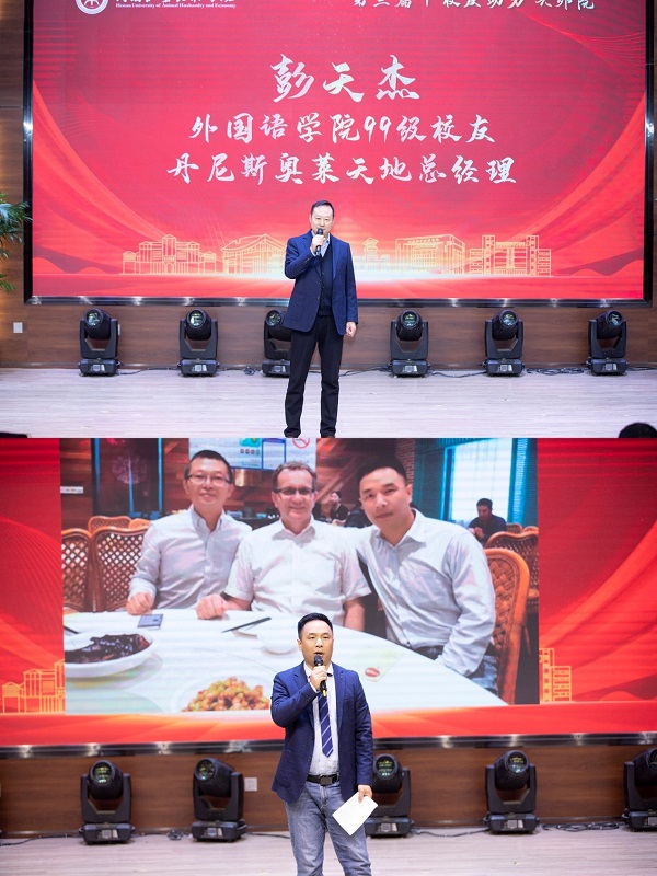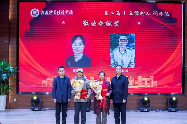 学院领导为吉蛋堂农业有限公司、94级校友、校友会会长黄明哲;听道教育集团创始人董事长、94级校友夏胜男;丹尼斯奥莱天地总经理、99级校友彭天杰;步威数码科技(上海)有限公司总经理、02级校友黄伟;郑州盛博文化传播有限公司总经理、08级校友李友君;中菲海外文化发展(河南)有限公司总经理、08级校友李金成以及校企合作伙伴新道科技股份有限公司河南分公司总经理郑胤颁奖。