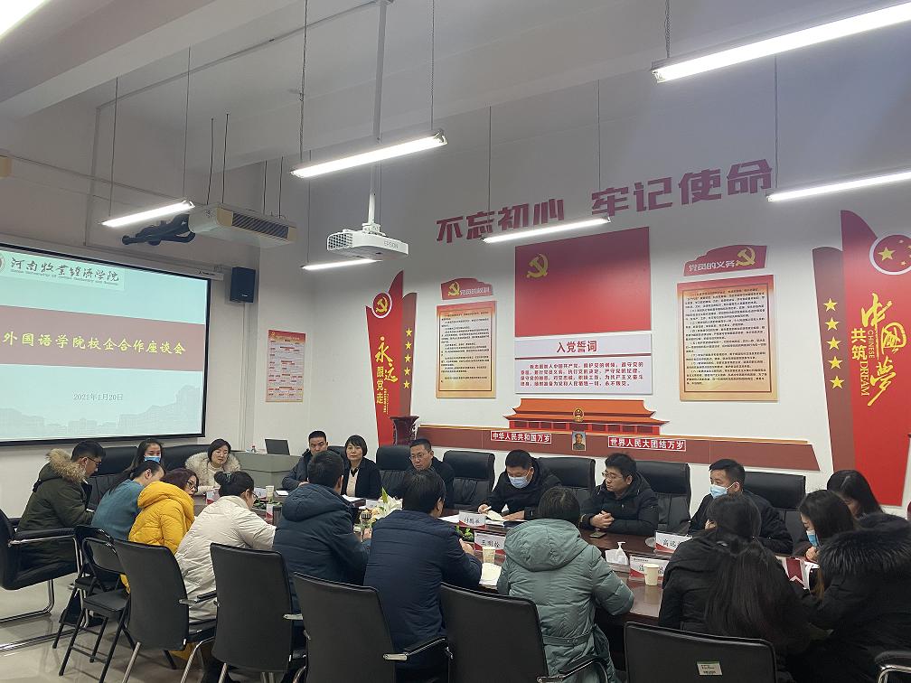 1月20日上午,今年会官方网站在一号教学楼524会议室召开校企合作座谈会。来自上海铭译翻译服务有限公司、郑州译线通翻译公司、河南杰尔古格机械有限公司、河南蓝谷网络科技有限公司、河南五季跨境教育科技有限公司、河南恒泰起重设备有限公司、郑州乐橙网络科技有限公司、英浦(北京)教育科技有限责任公司郑州分公司、郑州市听道外国语培训中心等九家企业代表应邀出席座谈会,今年会官方网站党委书记王明栓,院长陈延潼,副院长许海兰、巩坚,党委副书记李燚等领导以及商务英语教研室主任温晶晶参加了此次座谈会。会议由副院长许海兰主持。